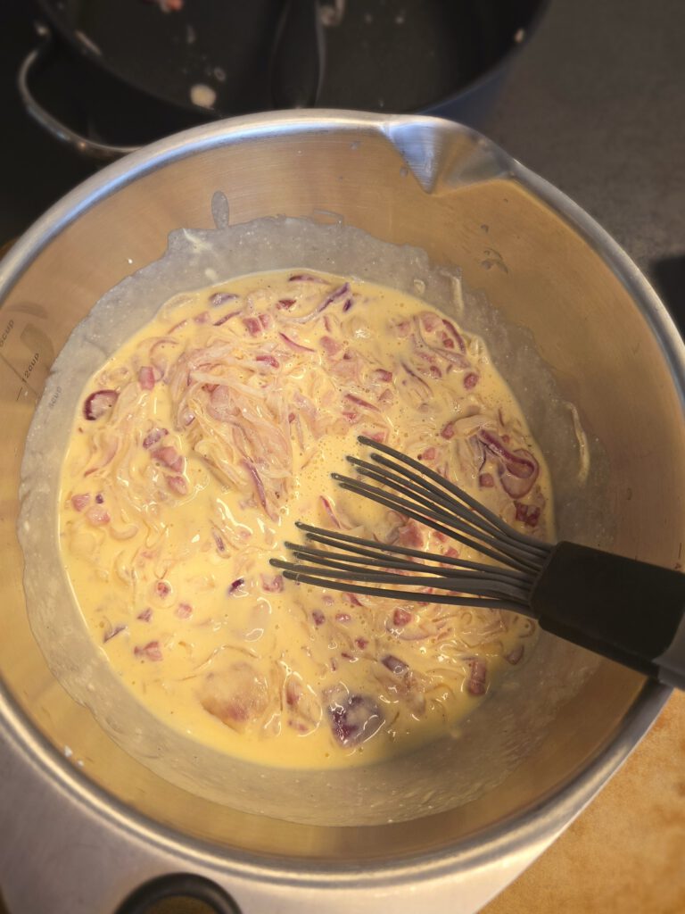 - Zwiebeln zu der Eimischung geben und alle gut vermengen