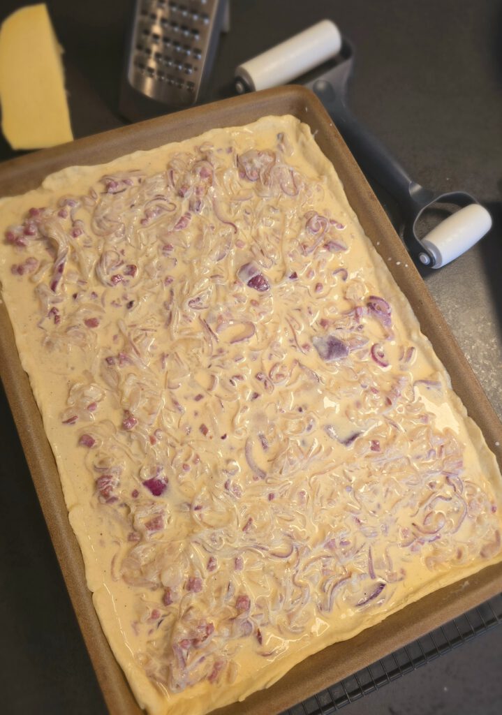 - Großen Ofenzauberer einfetten, Teig darauf geben und mit dem Teigroller ausrollen. Dabei mit der schmalen Seite des Teigrollers die Ränder etwas hochziehen