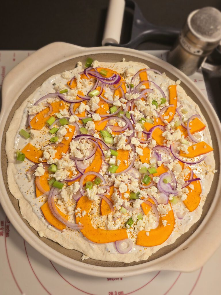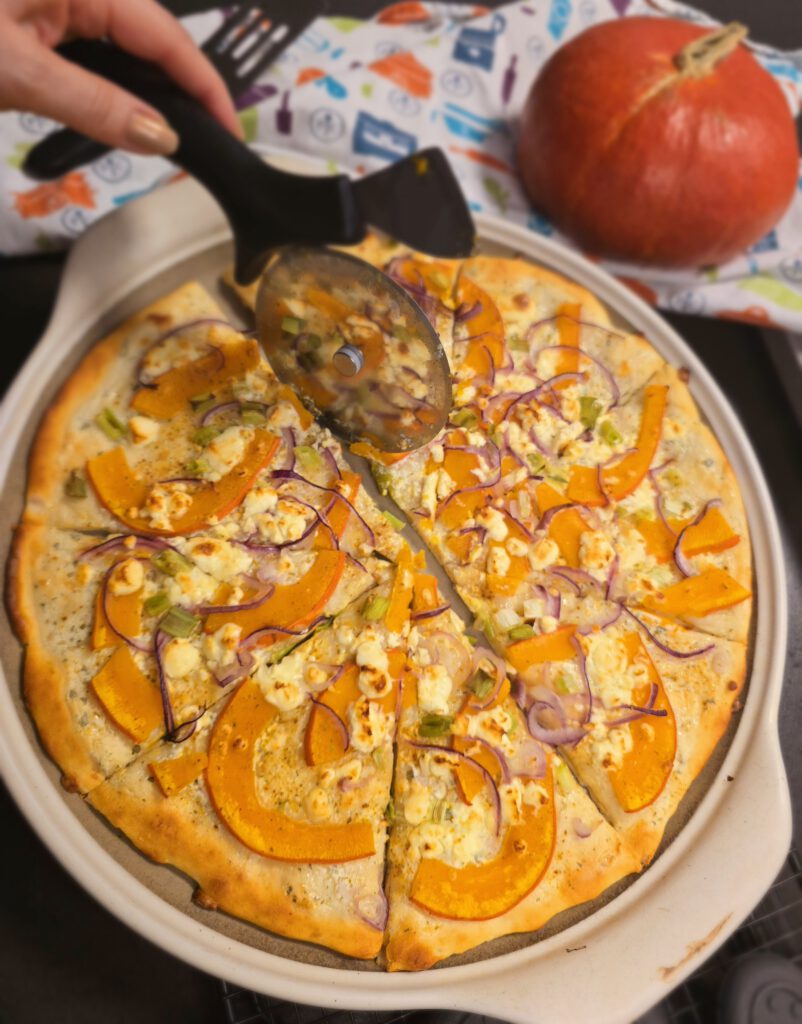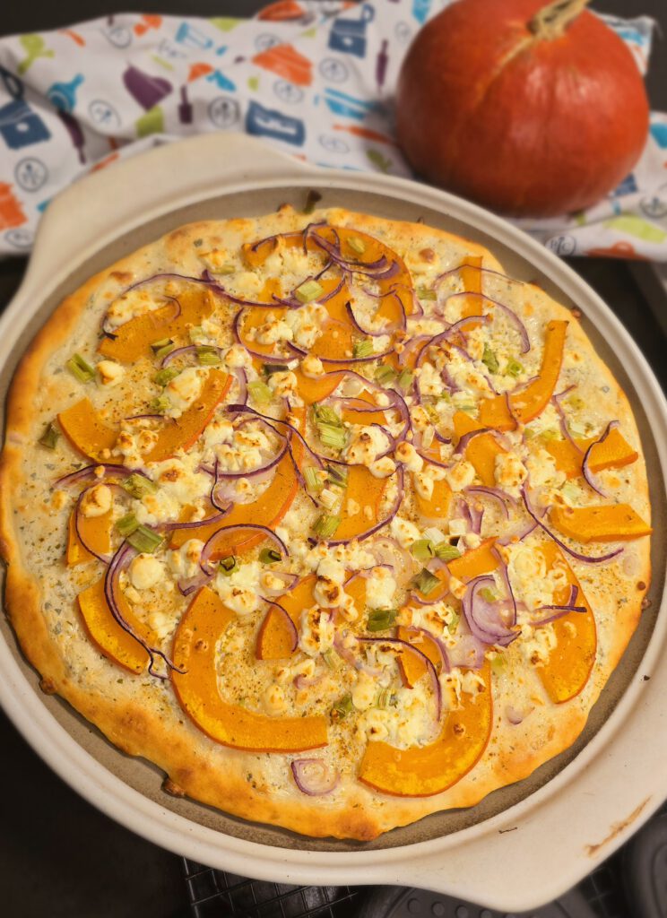 • Kürbis in dünne Scheiben schneiden, darauf verteilen und mit Kürbisgewürz oder Salz & Pfeffer würzen
