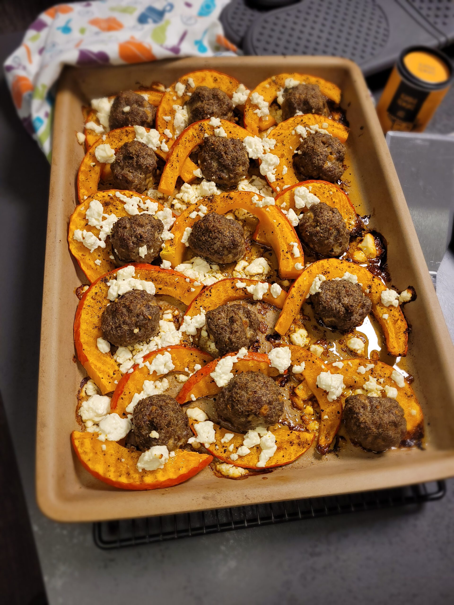 - Zerkrümelten Feta über dem Kürbis verteilen und weitere 10-15 Minuten backen1 P. Feta leicht