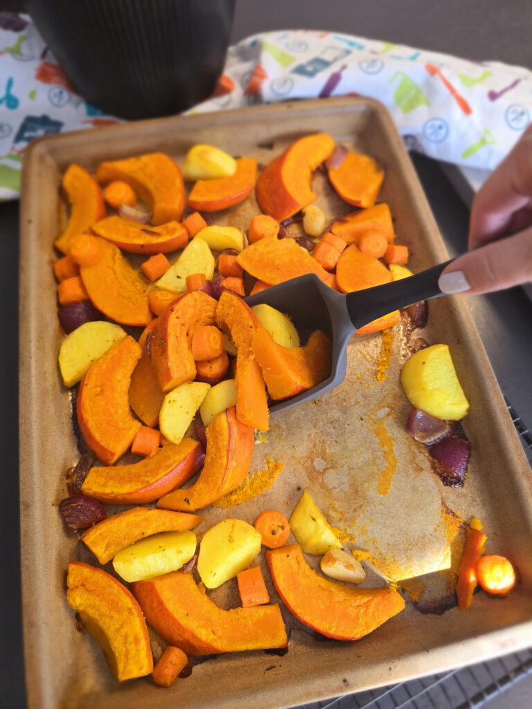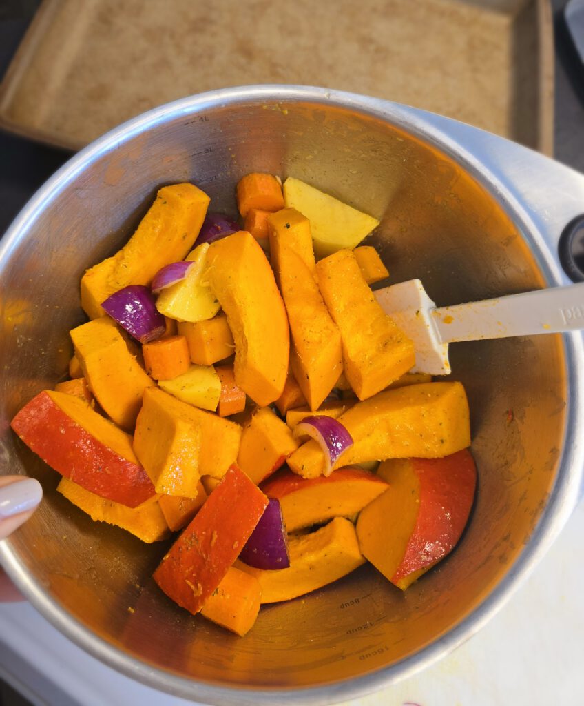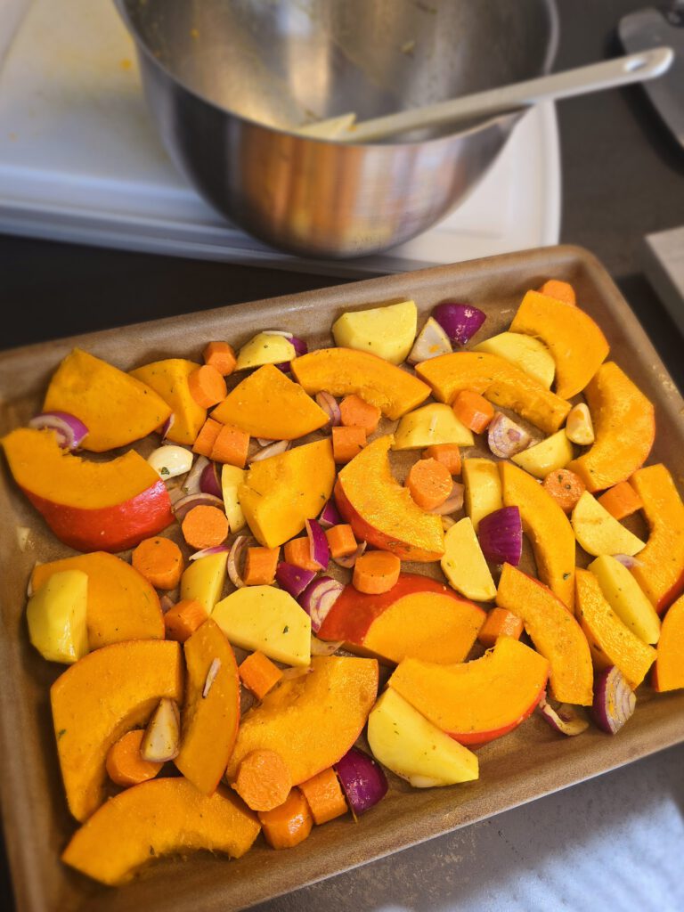 800 gr. Hokkaido Kürbis ohne Kerne, 2 Knoblauchzehen, 150 gr. Karotten geschält in Stücke, 200 gr. Kartoffeln geschält in Stücken, 2 rote Zwiebeln