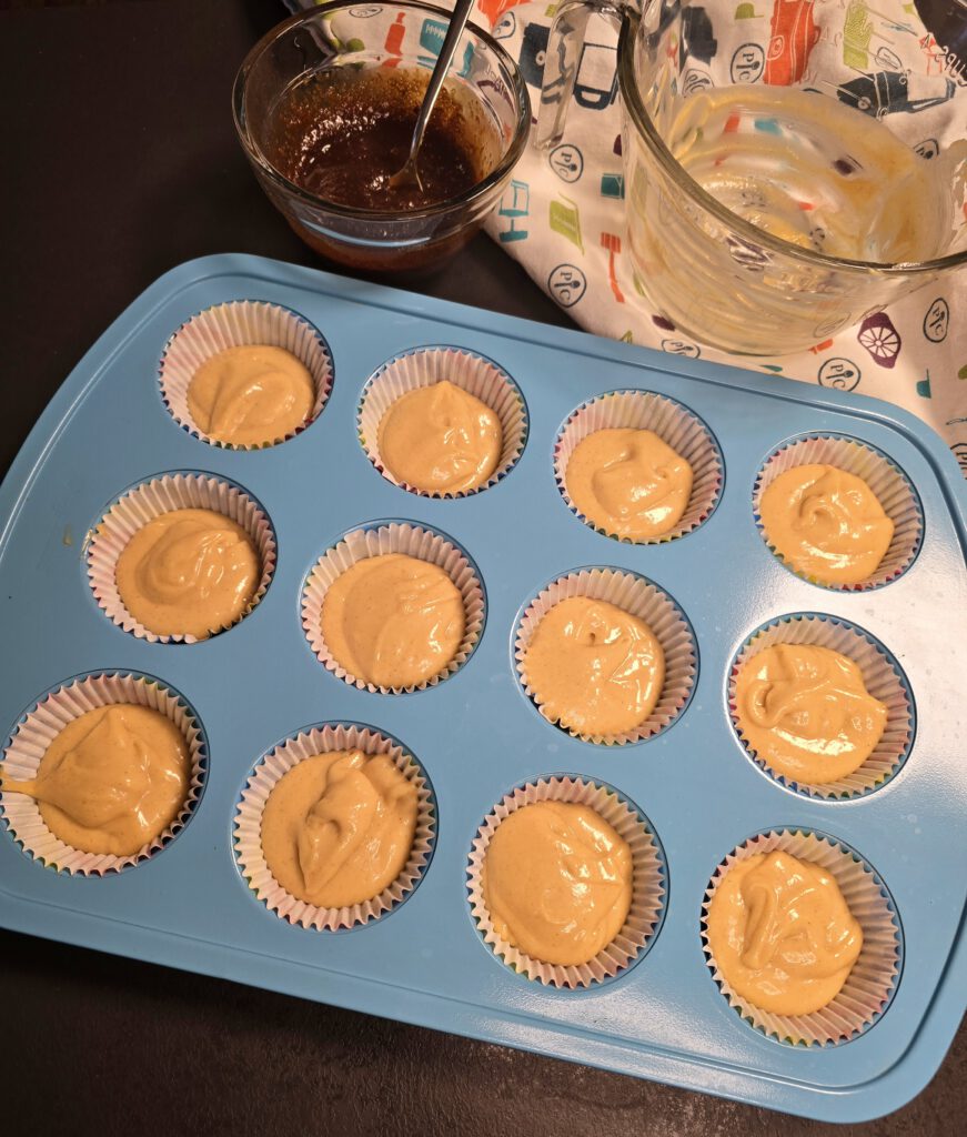 • Backofen auf 180 Grad Ober- und Unterhitze vorheizen, Cupcakeform mit Papierförmchen auslegen