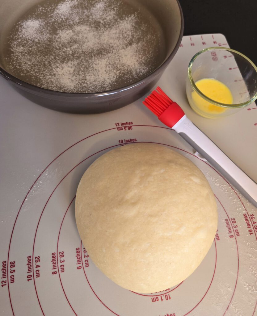• Runde Ofenhexe dünn einfetten und Teigunterlage bemehlen