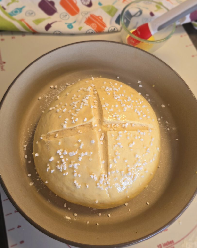 • Teig in die runde Ofenhexe legen, abgedeckt weitere 20 Minuten gehen lassen