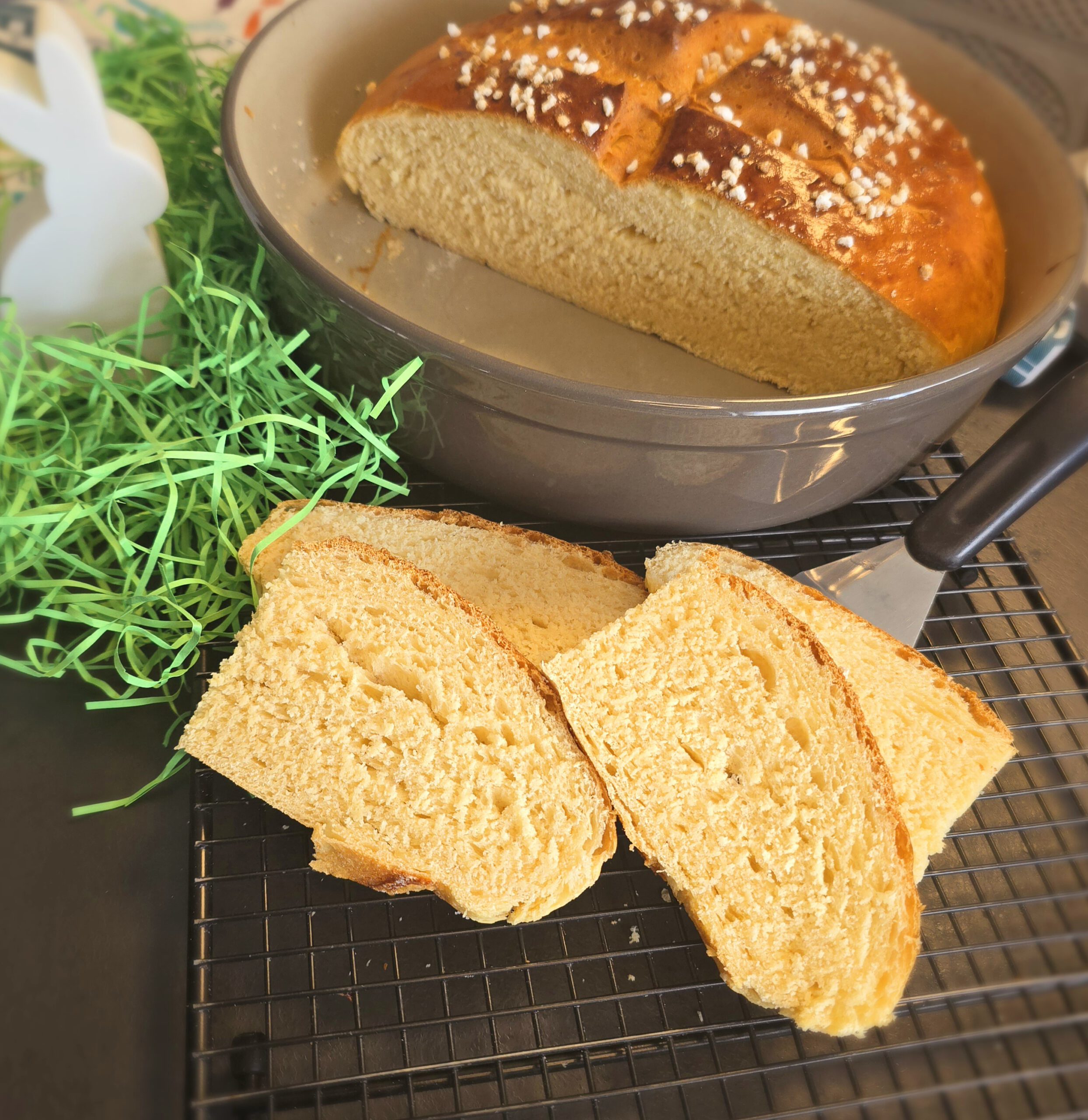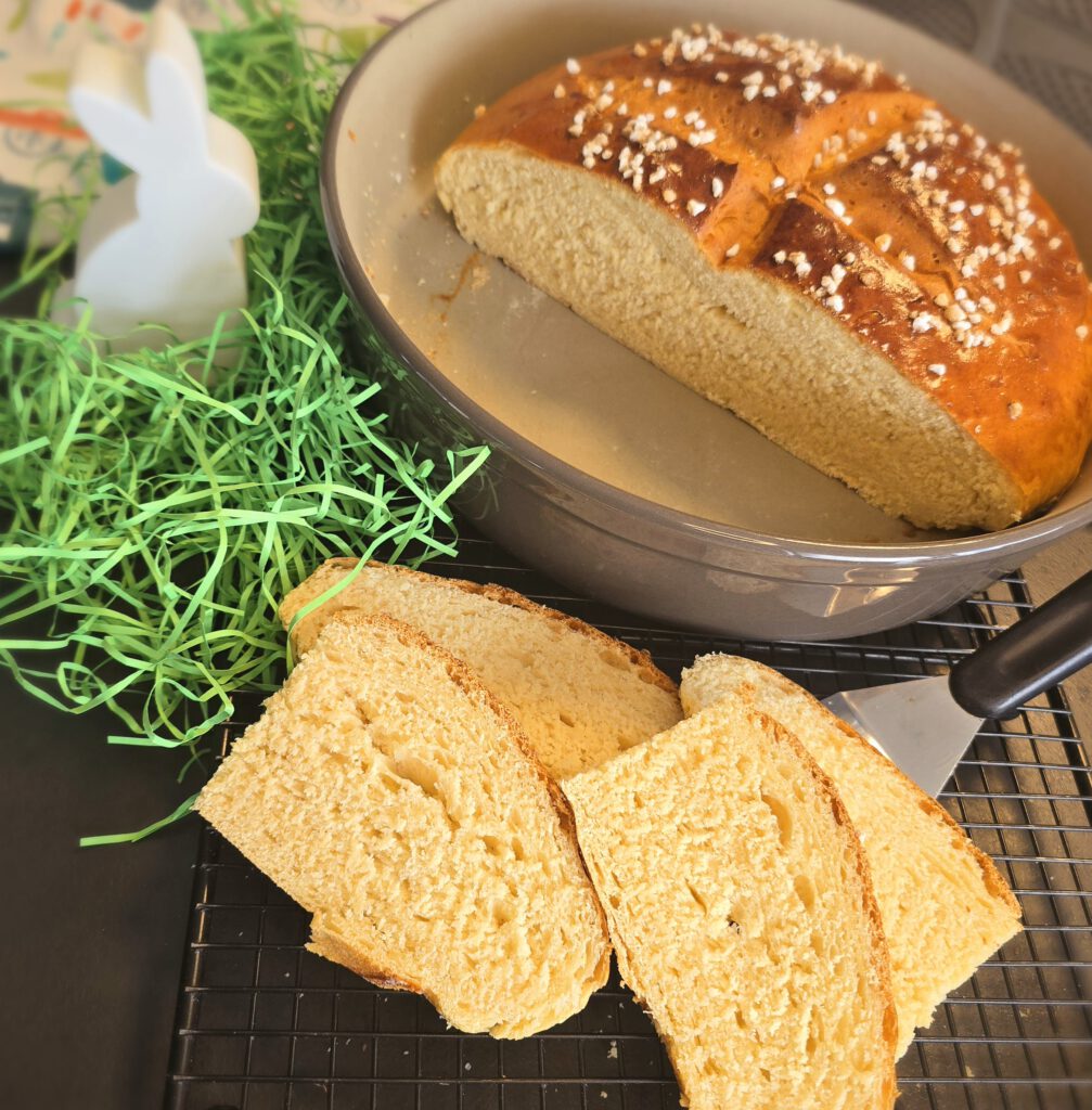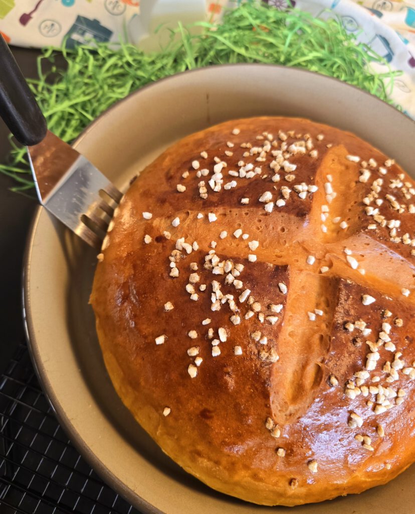 • Das Osterbrot lauwarm in der Form auskühlen lassen und danach mit dem kleinen Servierheber entnehmen