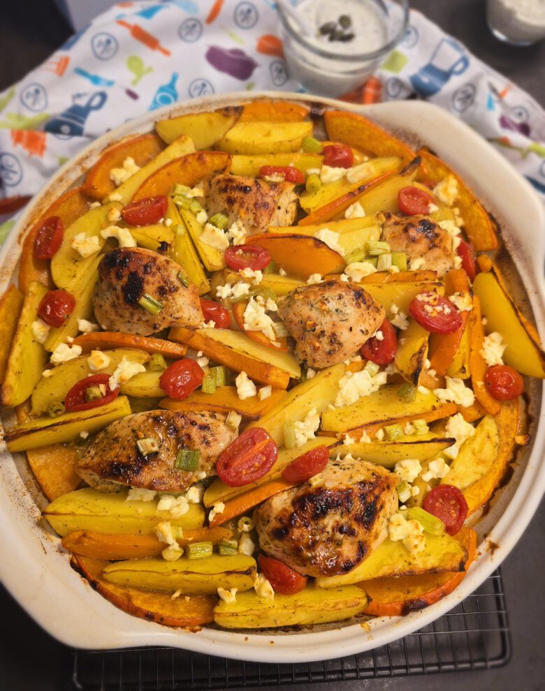 Schlemmerplatte mit Hähnchen, Kürbis und Kartoffeln