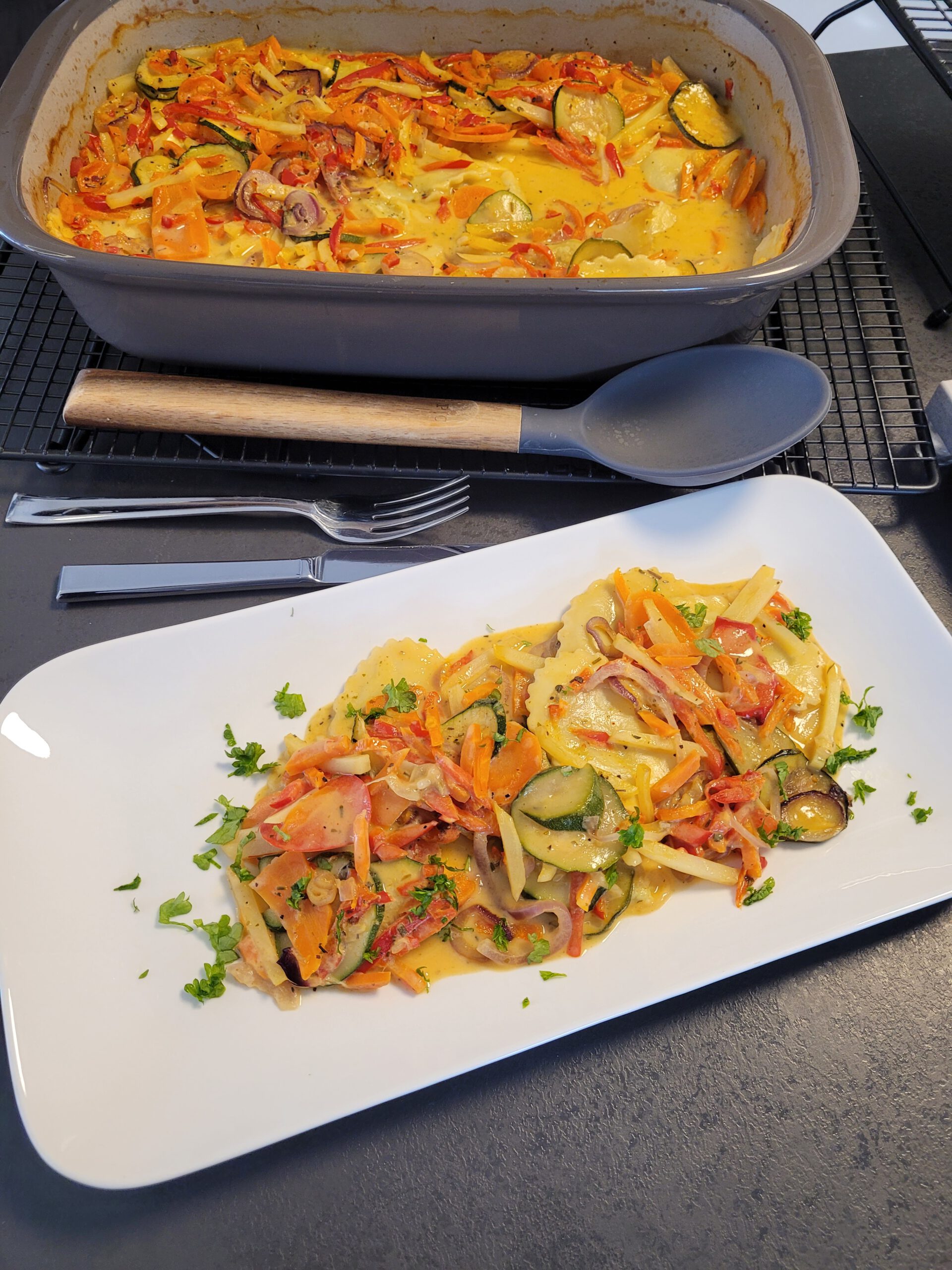 - Gemüse über die Tortellini in die Ofenhexe geben und verteilen