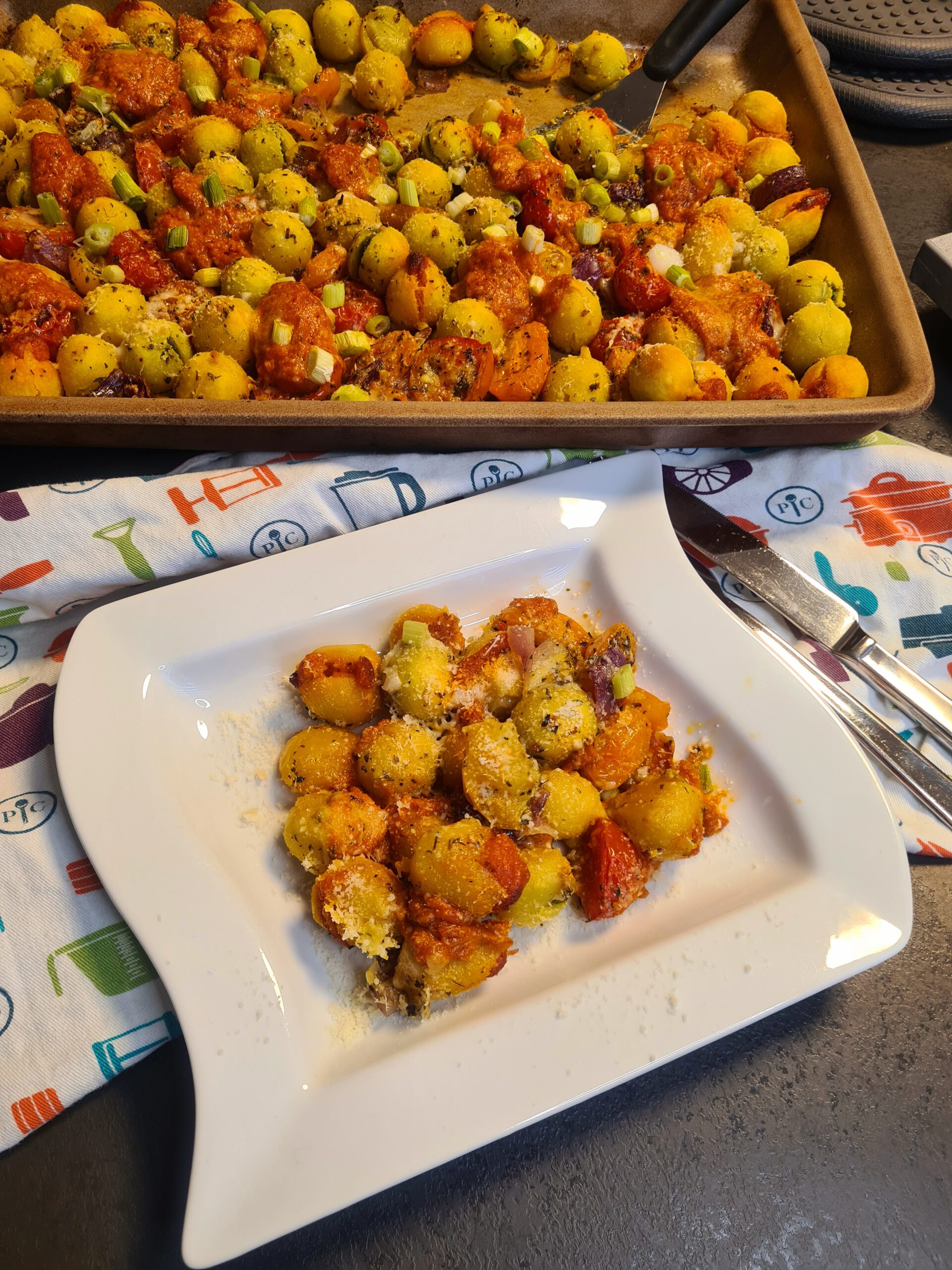 - Tomaten und Zwiebeln zu den Gnocchis auf den großen Ofenzauberer geben