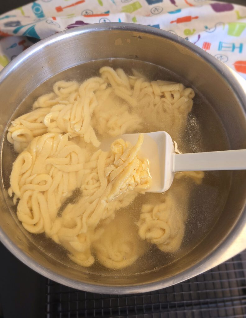 - Spätzle in die mittlere Edelstahlschüssel geben, mit heißem Wasser bedecken und Spätzle vorsichtig trennen1 kg Spätzle aus dem Kühlregal