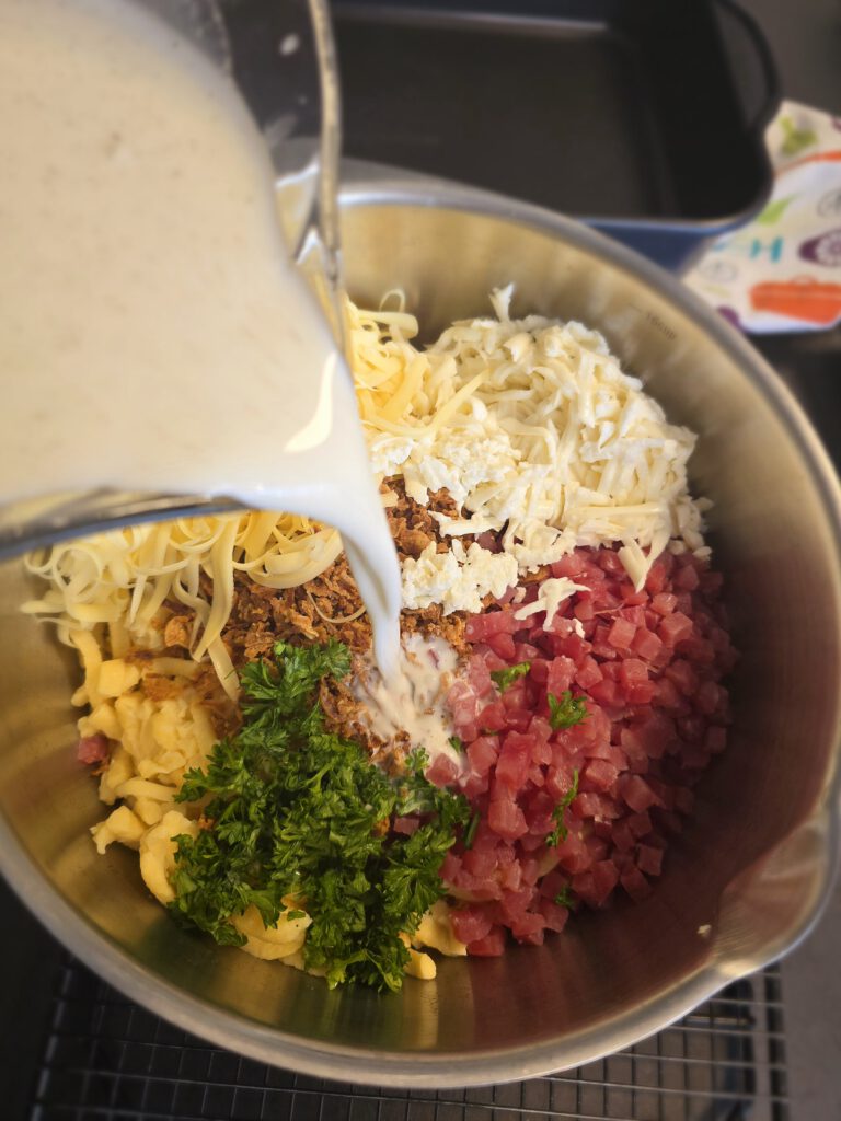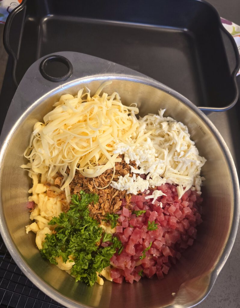 - 120 gr. Käse reiben und ebenfalls dazu geben120 gr. geriebenen Käse