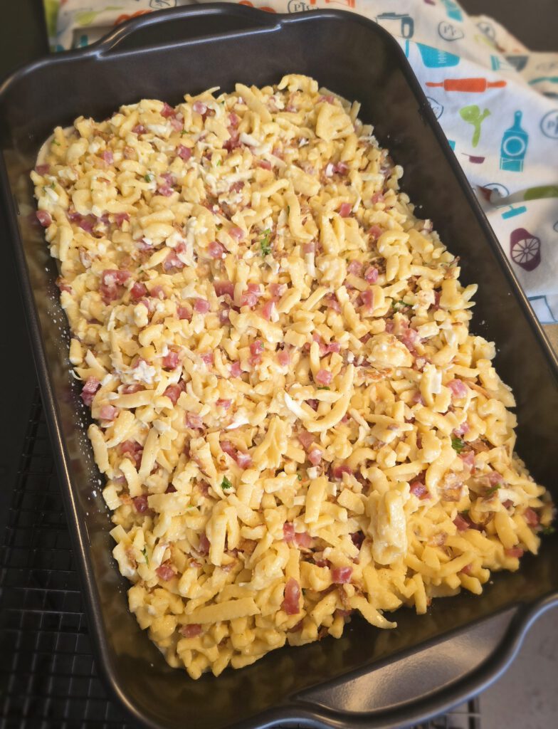 - Eine Kugel Mozzarella mit der groben Reibe reiben und zu den Spätzle geben1 Kugel Mozzarella leicht