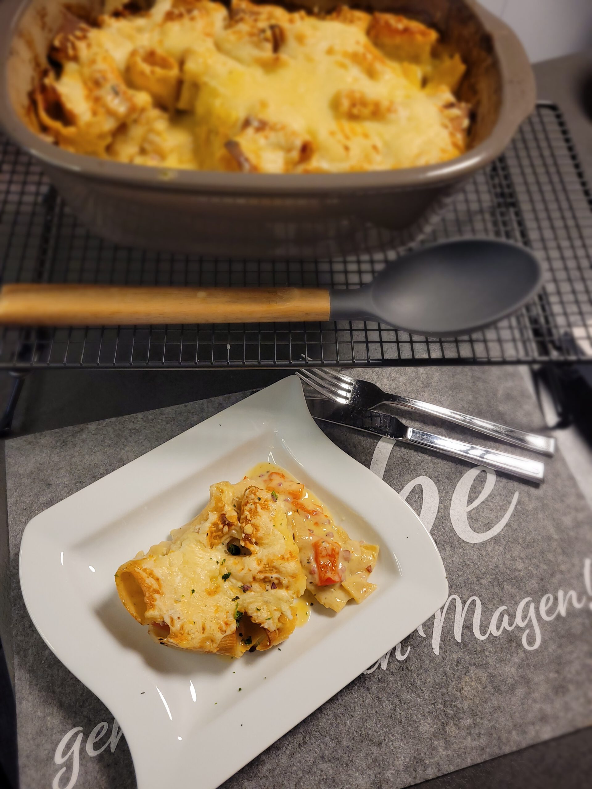 • Soße über die Nudeln in den Ofenmeister geben, alles gut durchmengen
