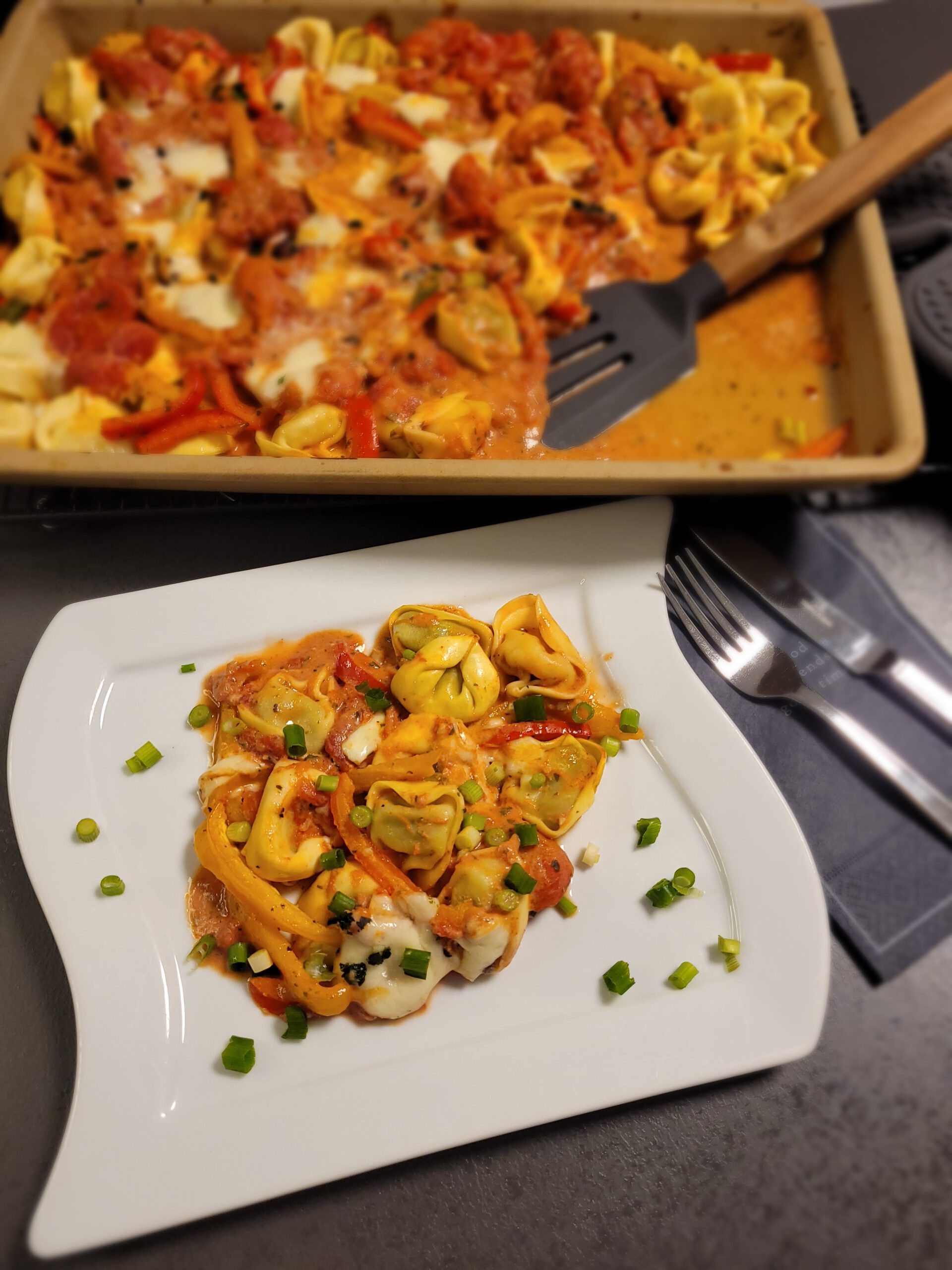- Tortellini in die mittlere Edelstahlschüssel geben und mit Olivenöl vermischenAuf dem großen Ofenzauberer verteilen750 gr. Tortellini nach Wahl (Kühlregal), 10 gr. Olivenöl