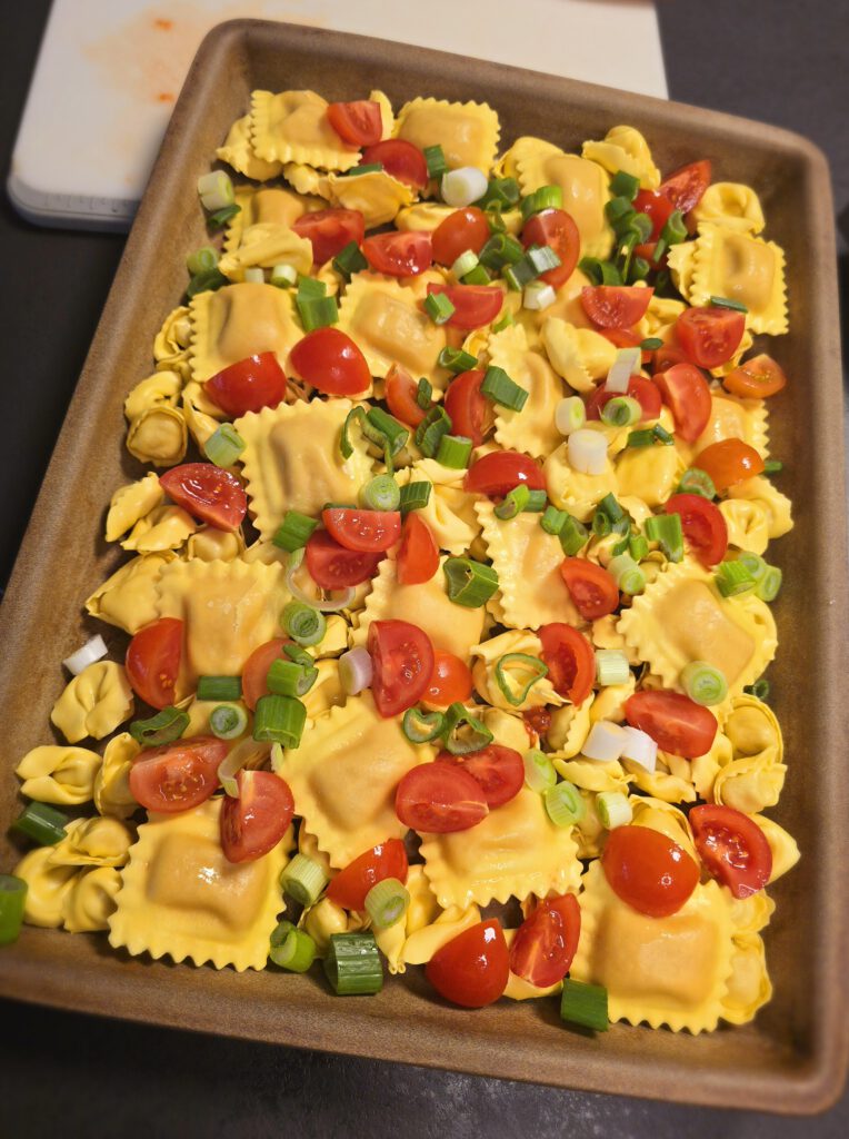 - Tomaten und Frühlingszwiebeln über den Tortellini verteilen