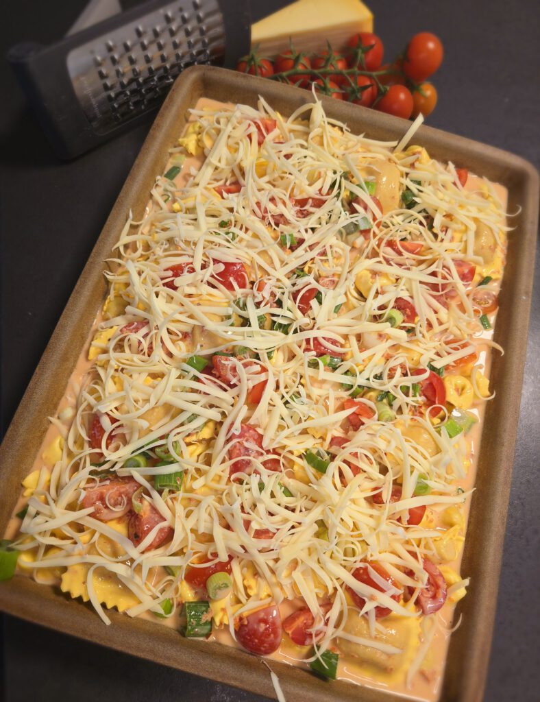 - Tortellini auf dem großen Ofenzauberer verteilen.Tomaten halbieren, Frühlingszwiebeln in Ringe schneiden750 gr. Tortellini nach Wunsch aus dem Kühlregal, 250 gr. kleine Tomaten, 3 Frühlingszwiebeln