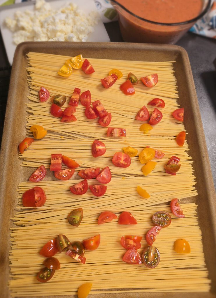 - Tomaten halbieren oder viertel und über den Spaghetti verteilen150 gr. kleine Tomaten