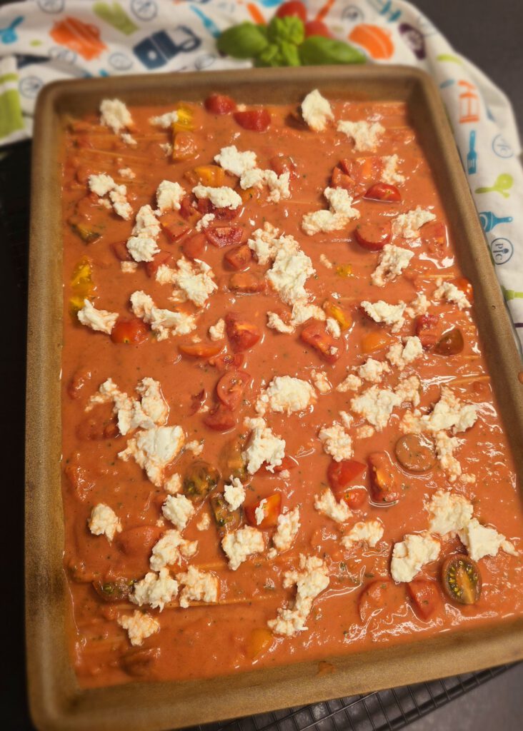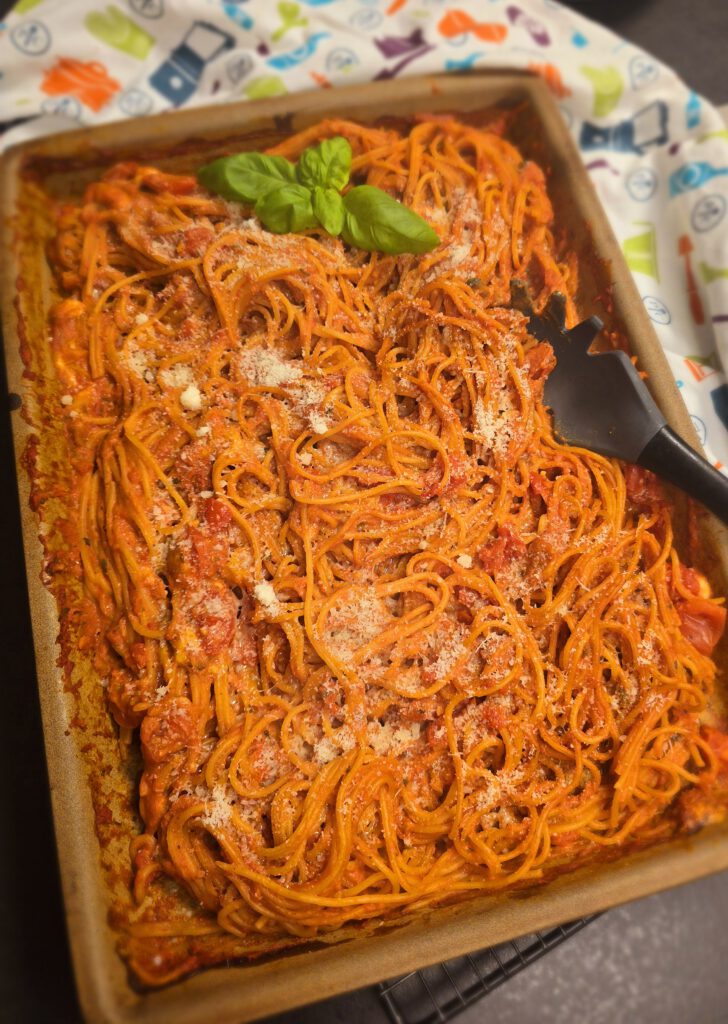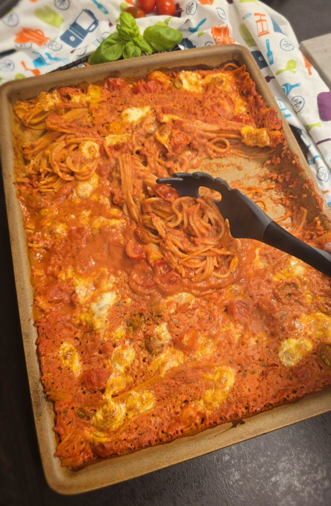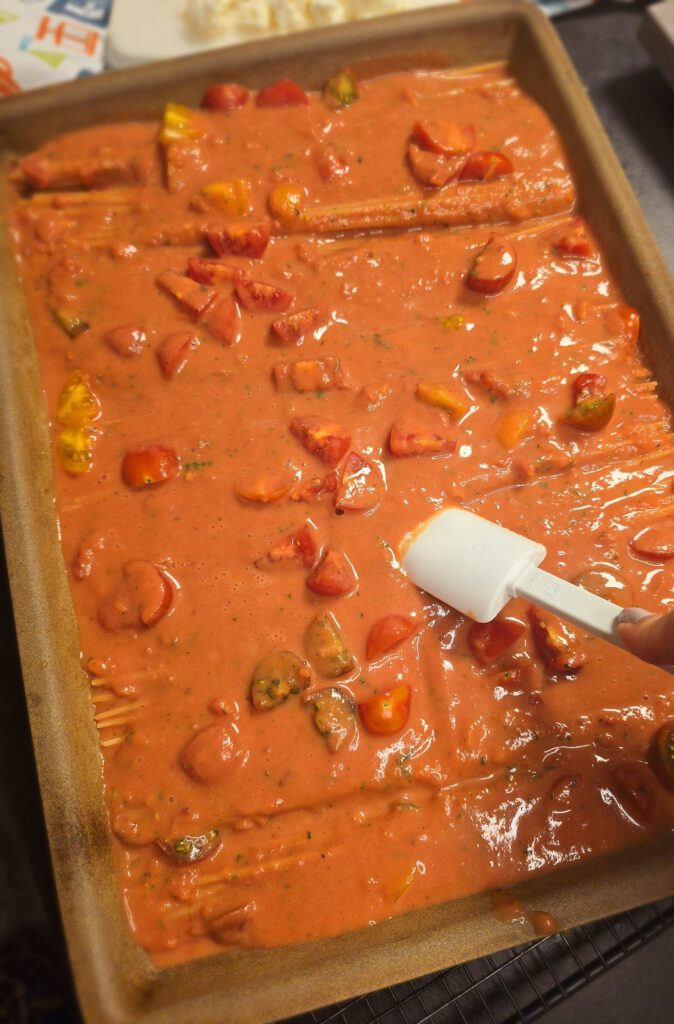 - Mit einem Schaber etwas hin und her schieben, dass sich die Soße gut verteilt. Die Spaghetti müssen komplett bedeckt sein