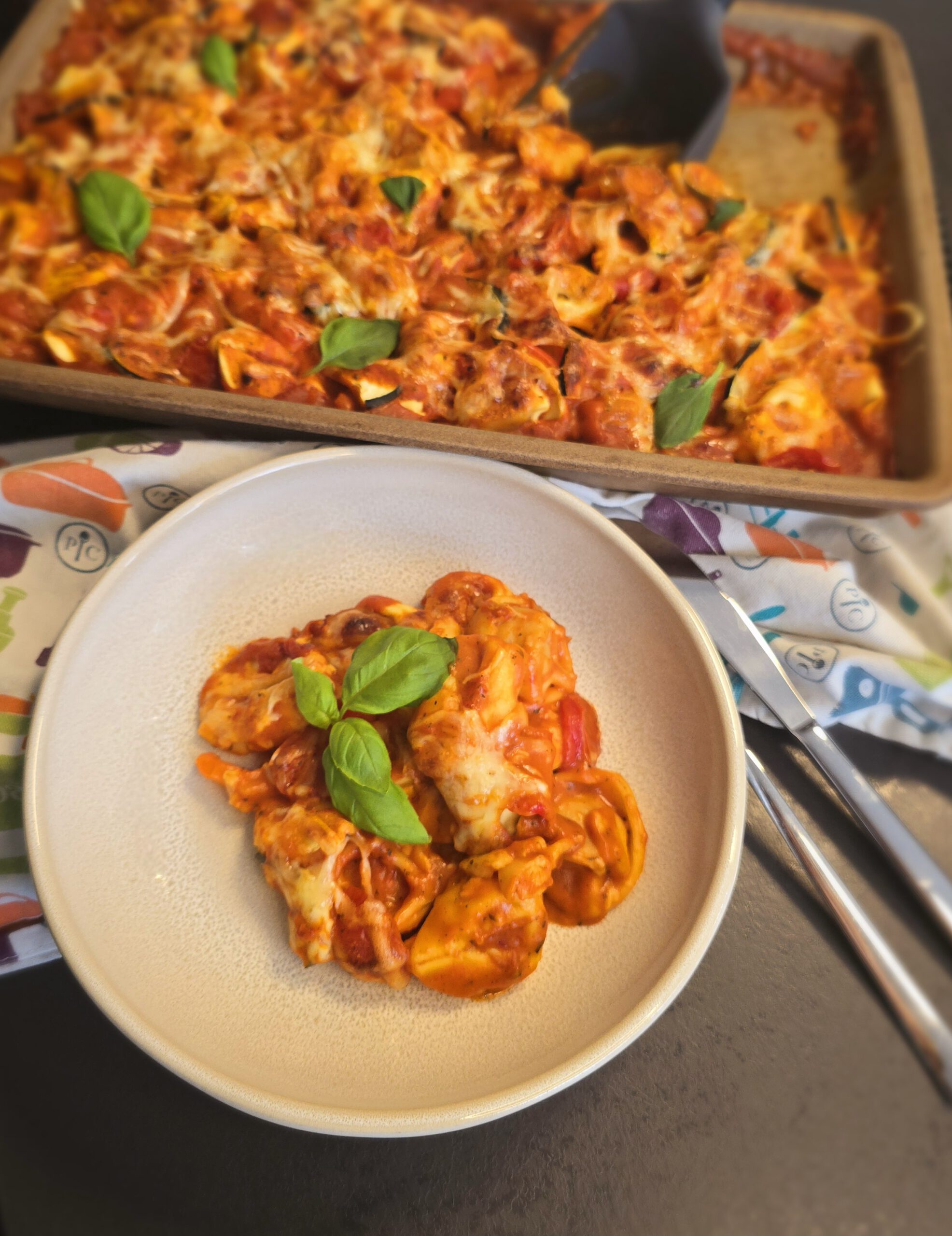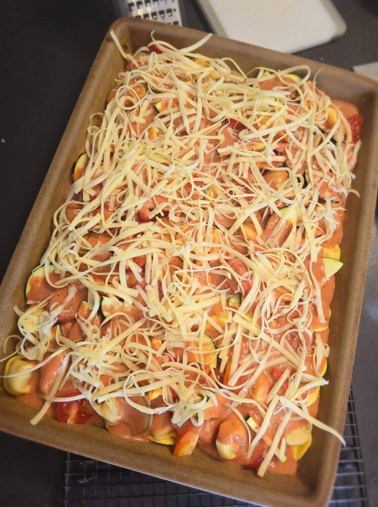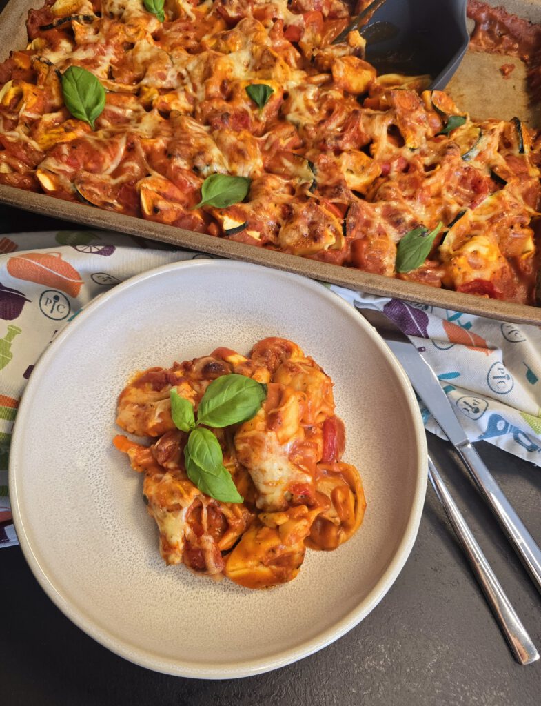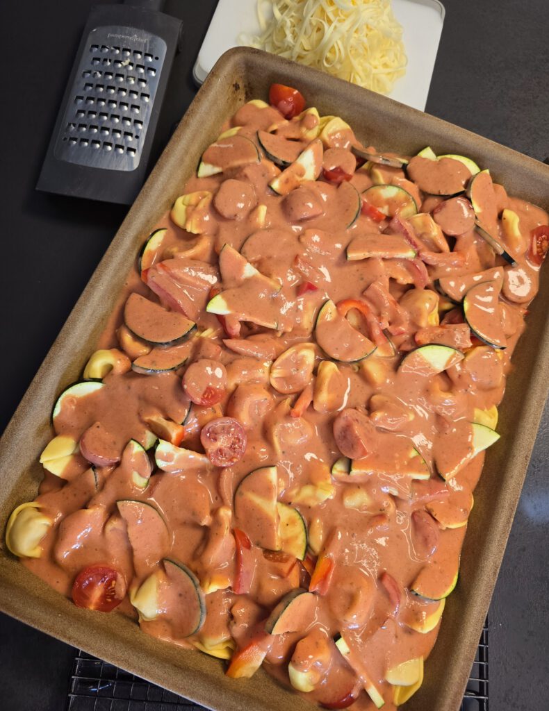 • Soße über den Tortellini und dem Gemüse verteilen