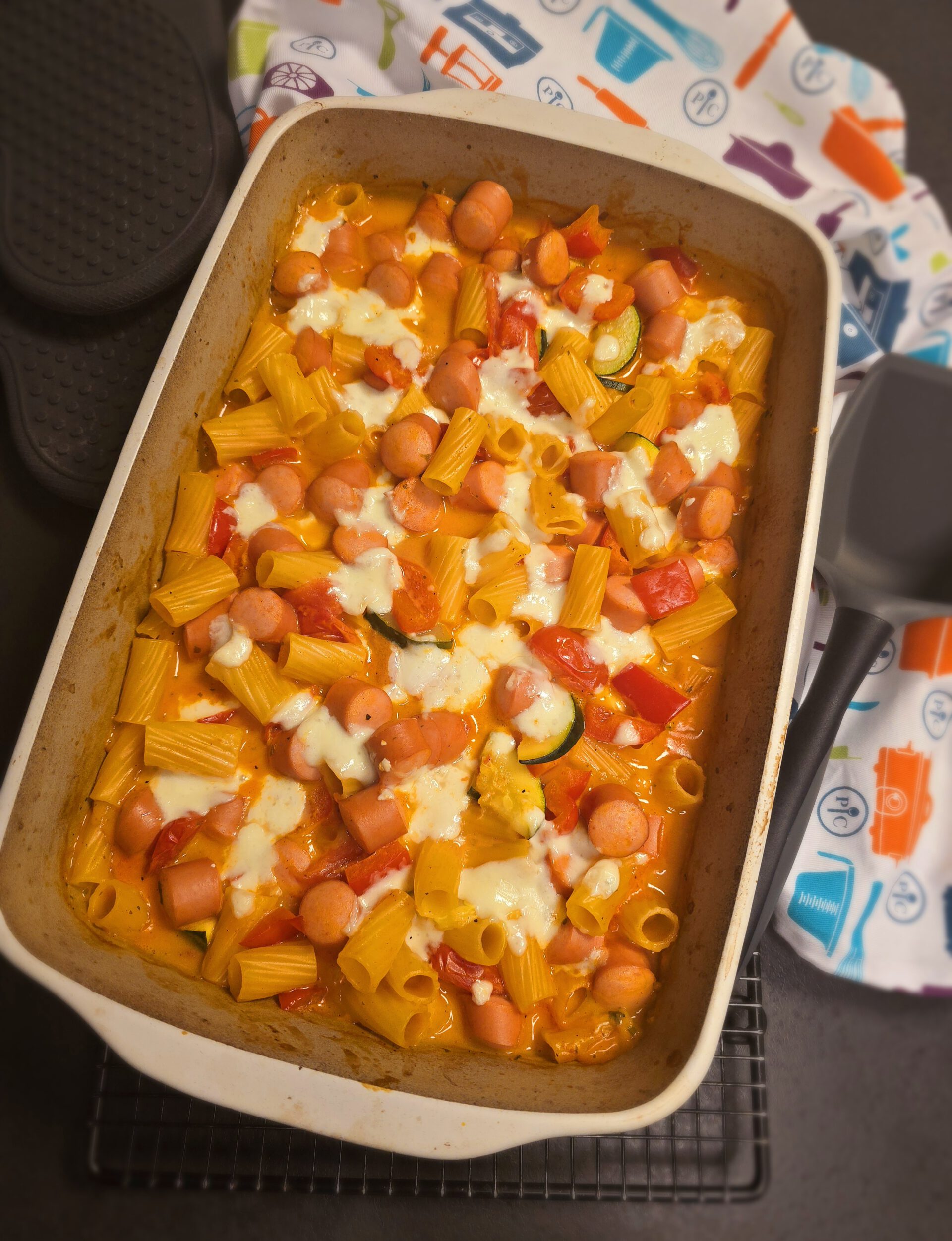 - Nudeln in die Ofenhexe geben. Würstchen in Scheiben schneiden und dazu geben.Paprika in kleine Stücke schneiden, Zucchini in Scheiben schneiden, Cocktailtomaten halbieren300 gr. Nudeln, z.B. Rigatoni, 1 rote Paprika, 1 kleine Zucchini, 8 Wiener-Würstchen, 10 Cocktailtomaten