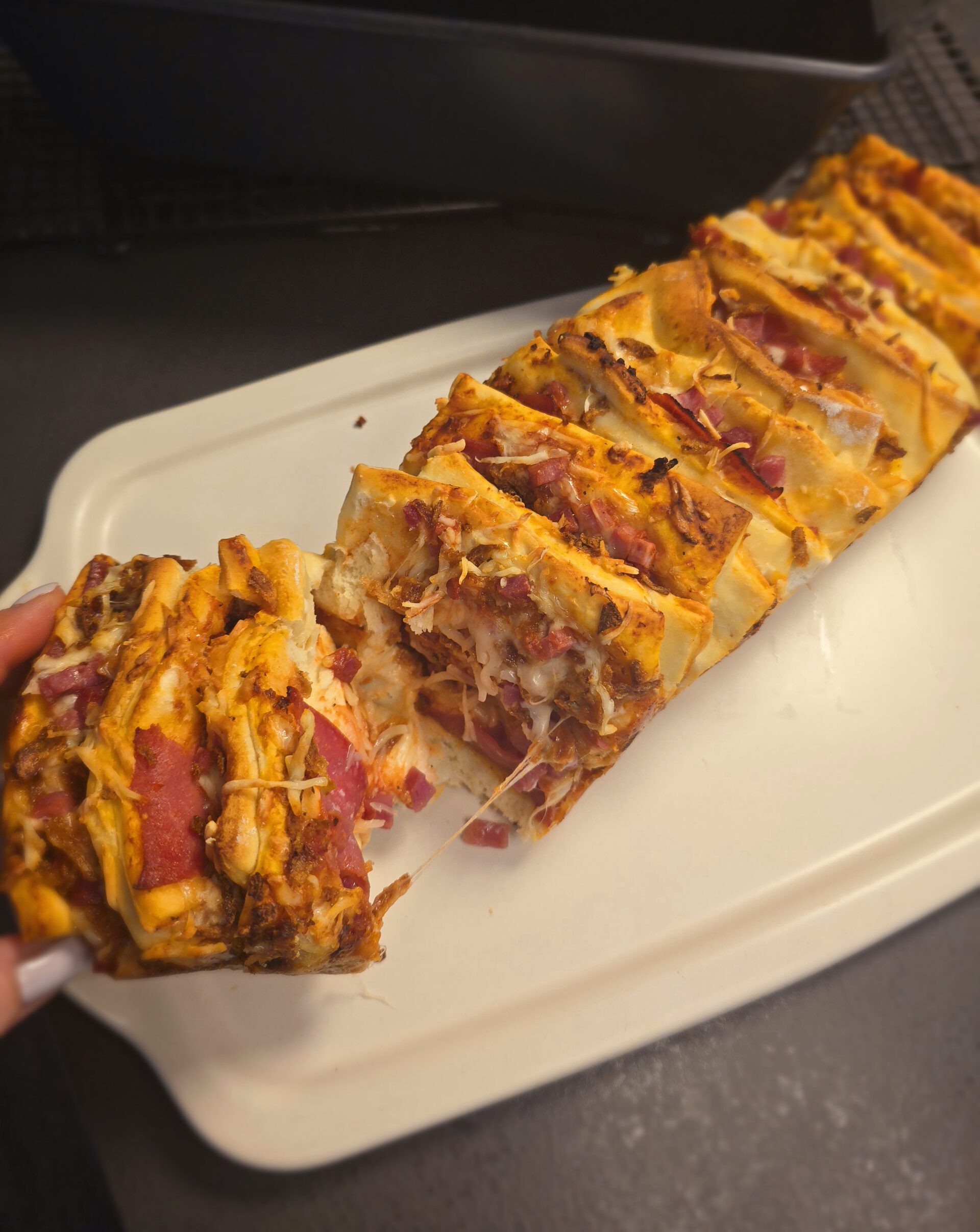 - Das Pizzabrot wieder umdrehen und auf dem Servierzauberer servieren und genießen.