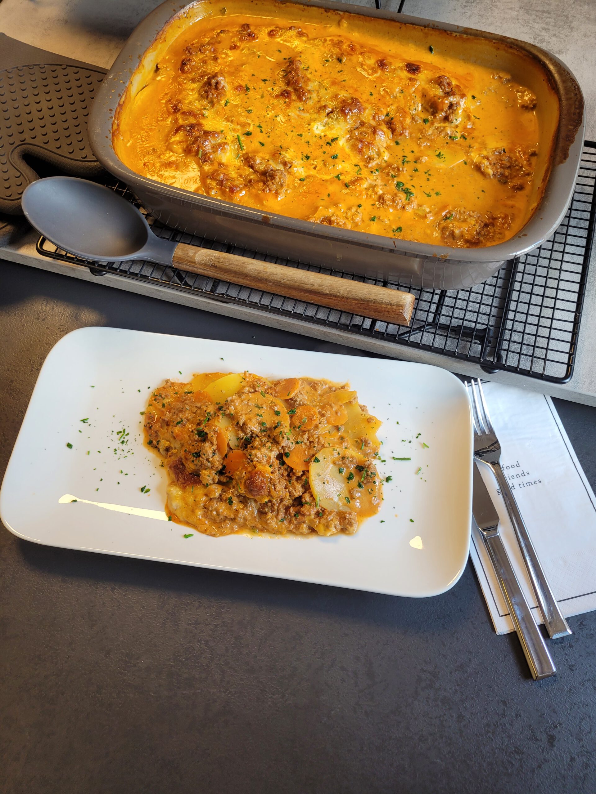 • Hackfleischsoße über die Kartoffeln/Karotten mit der Soße schütten und glatt streichen
