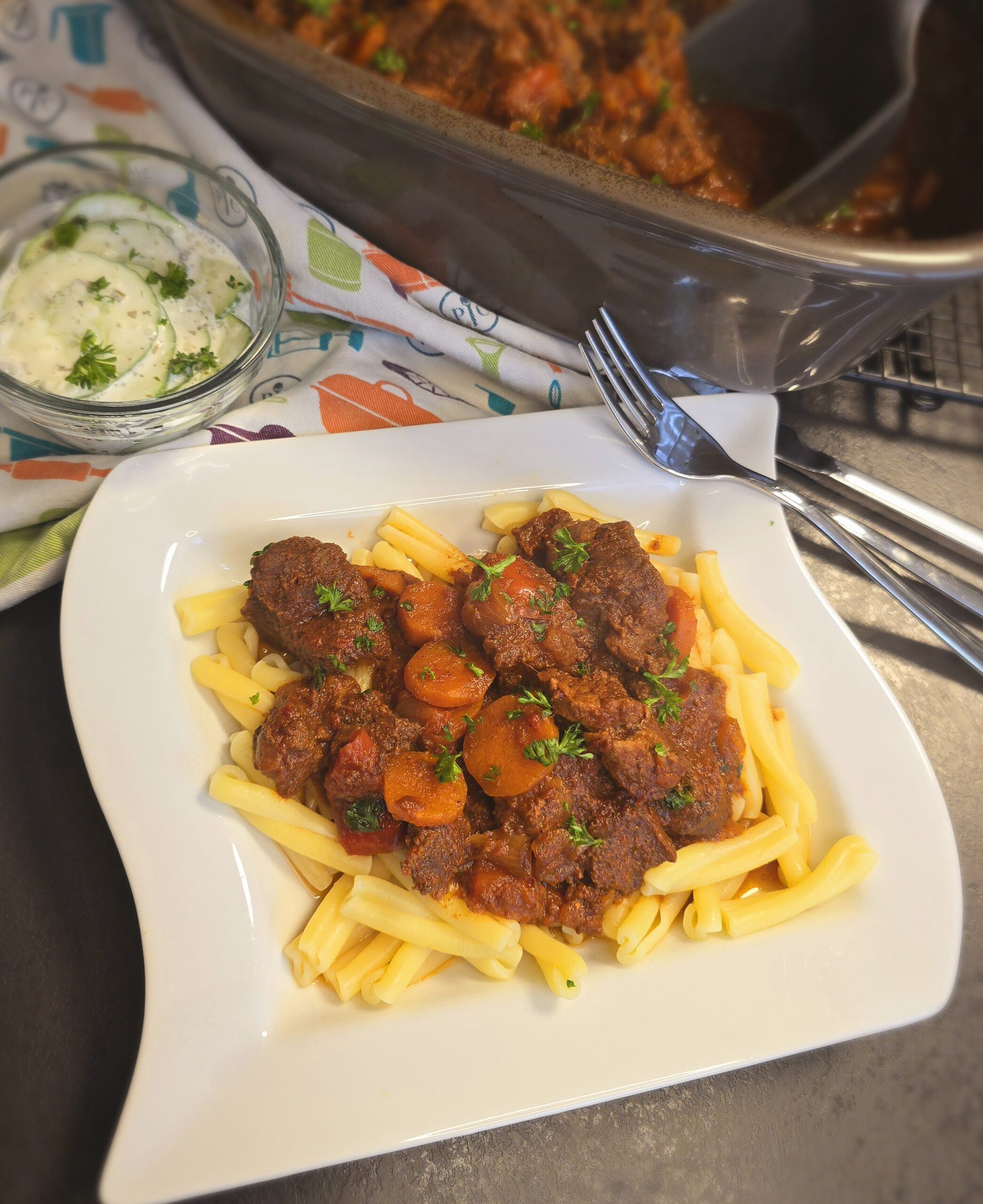 1 kg Rindergulasch, 2 gehäufte TL Gulaschgewürz