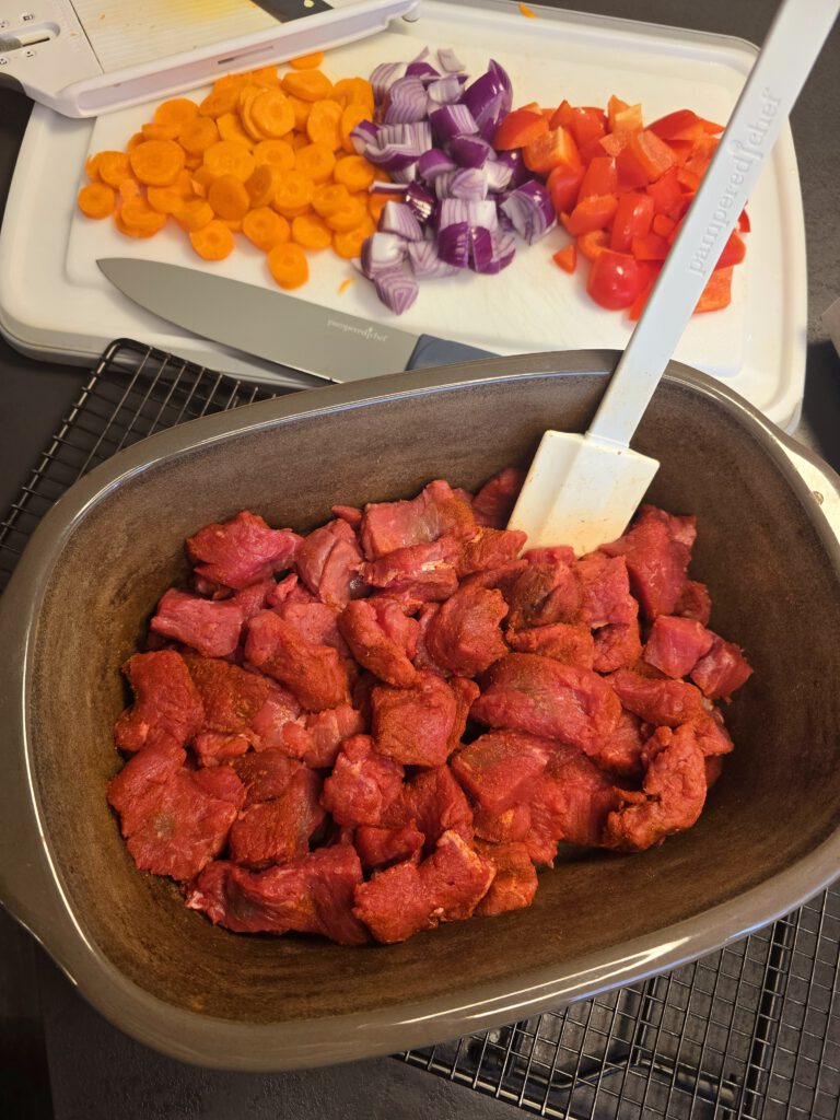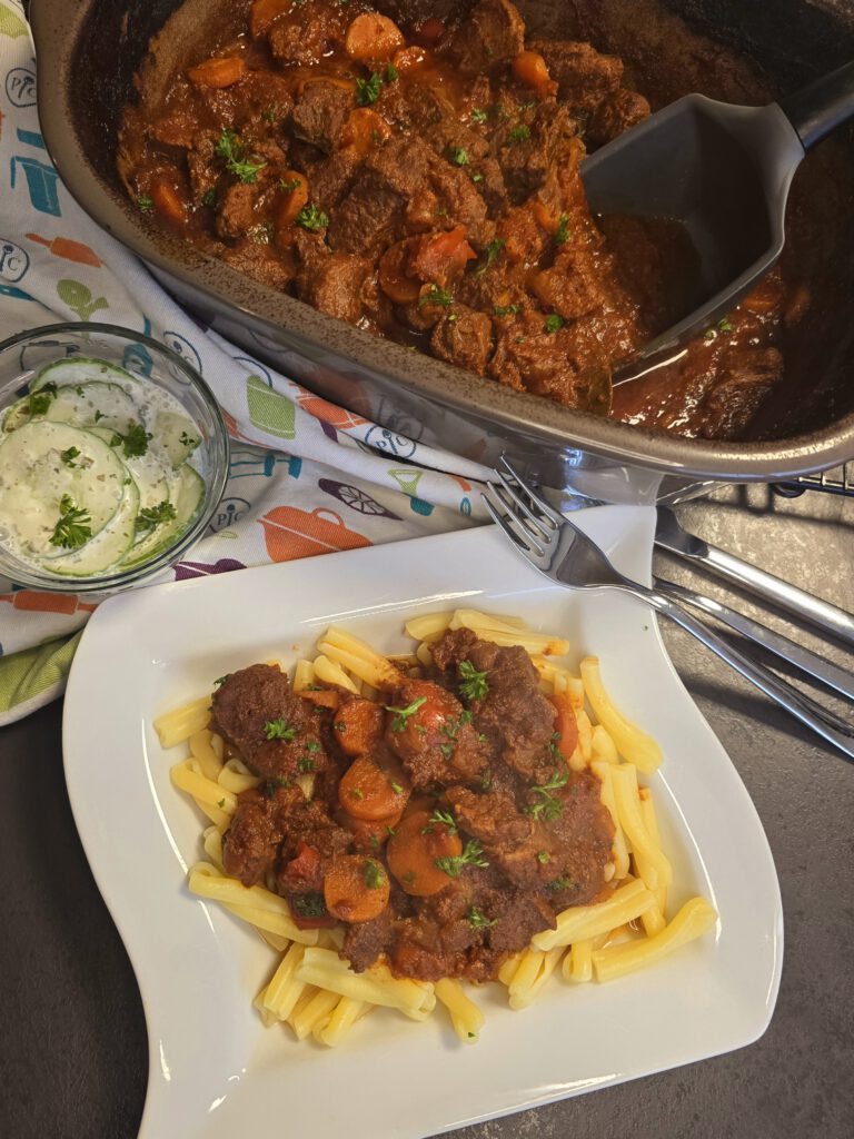1 kg Rindergulasch, 2 gehäufte TL Gulaschgewürz