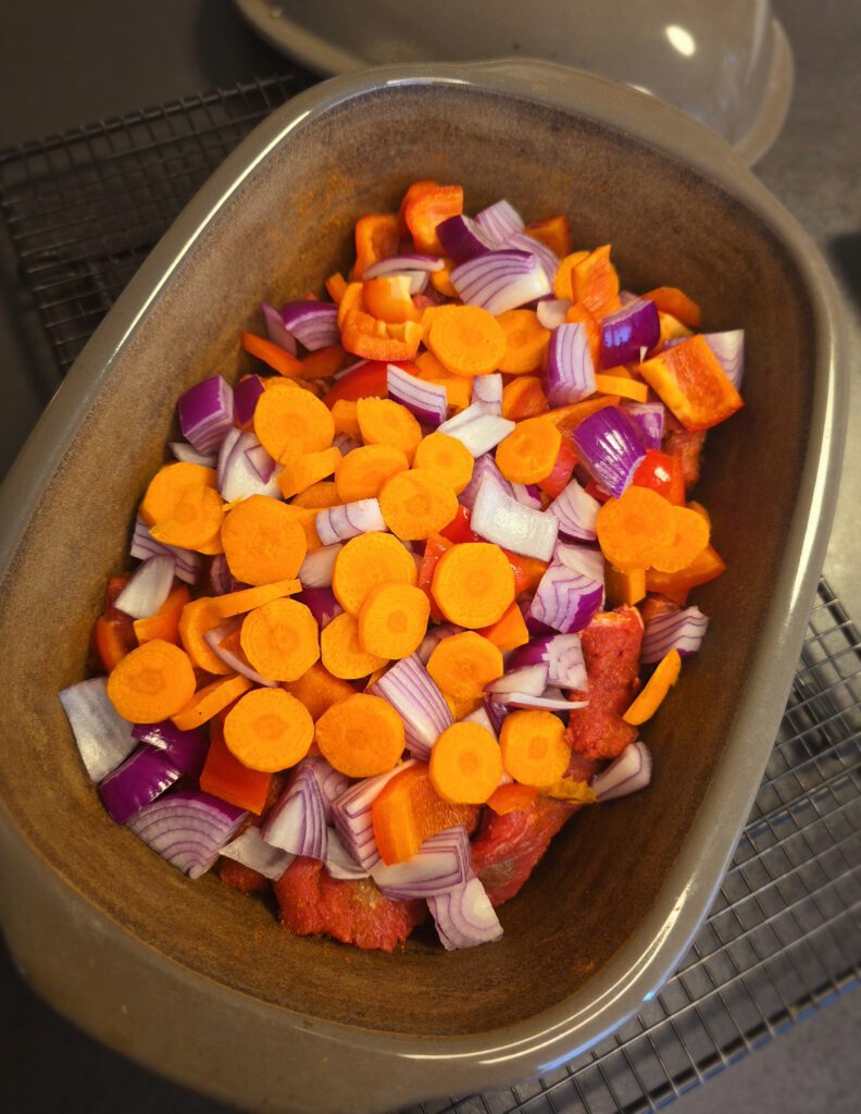 2-3 rote Zwiebeln, 2 rote Paprika, 3 Karotten