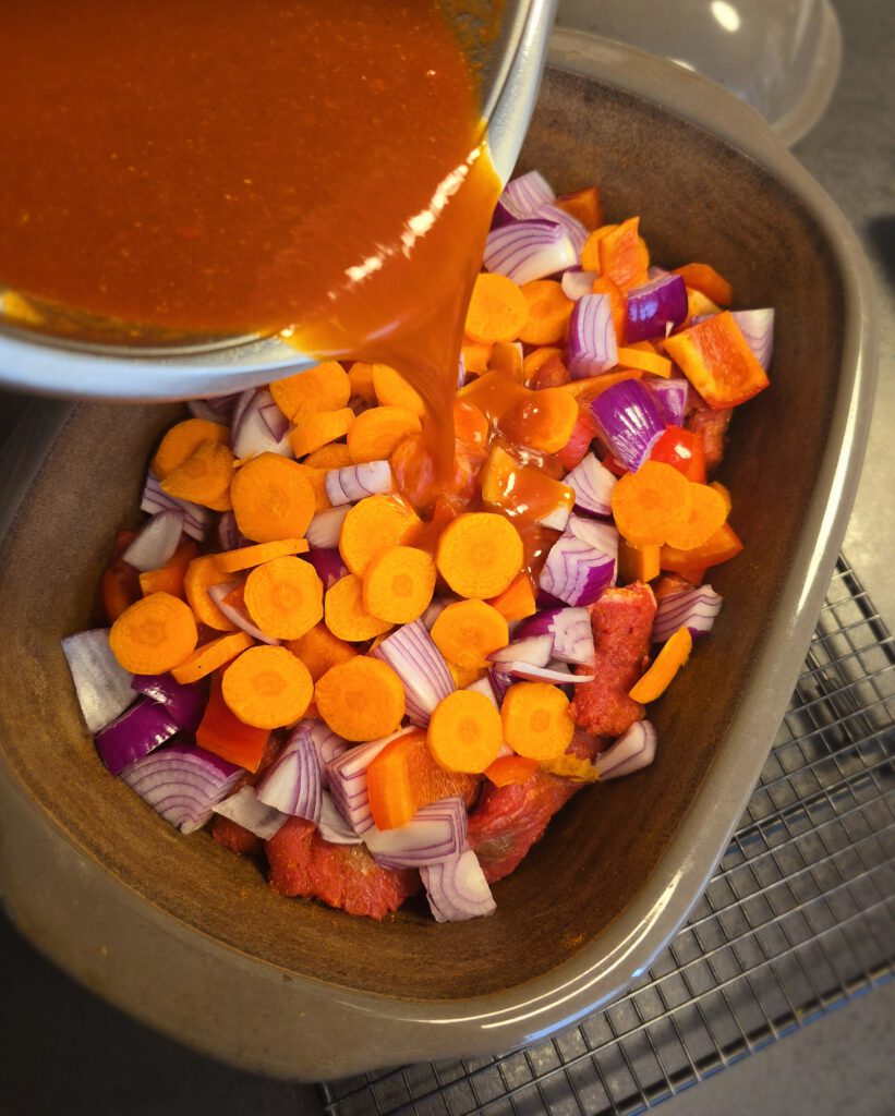 • Gulasch in den Ofenmeister legen, Gulaschgewürz darüber geben und vermengen
