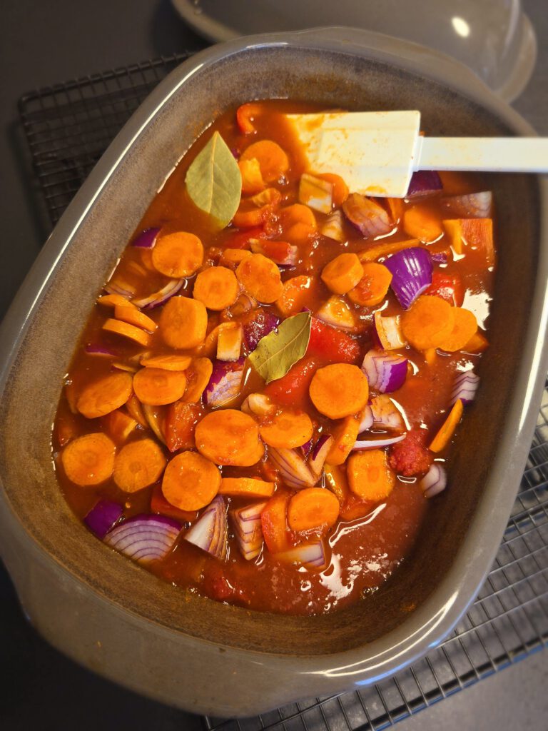 • Malzbier, Wasser, Tomatenmark, Paprika edelsüß, Salz, Gemüsebrühepaste und Pfeffer gut miteinander verrühren