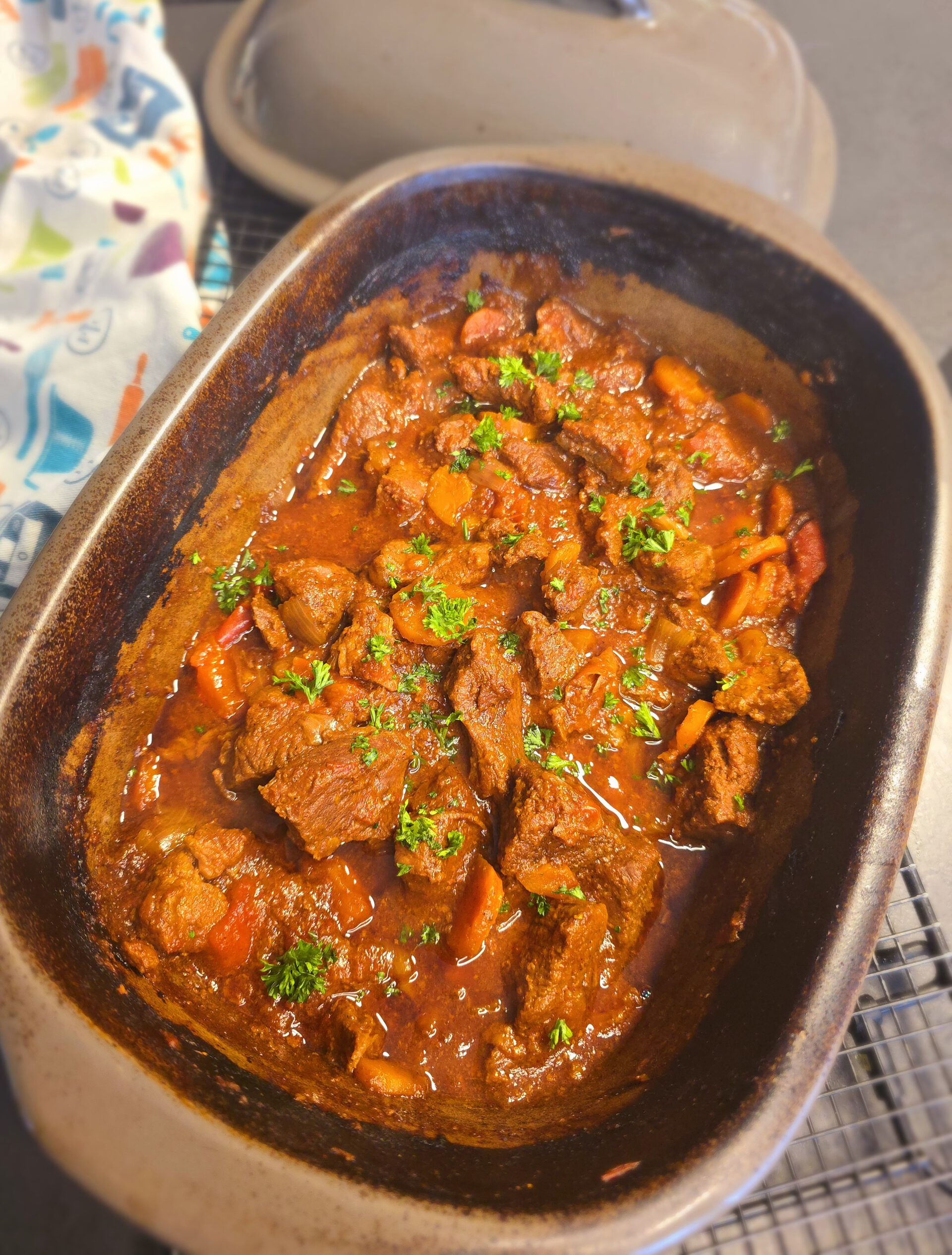 - Gulasch in den Ofenmeister legen, Gulaschgewürz darüber geben und vermengen1 kg Rindergulasch, 2 gehäufte TL Gulaschgewürz