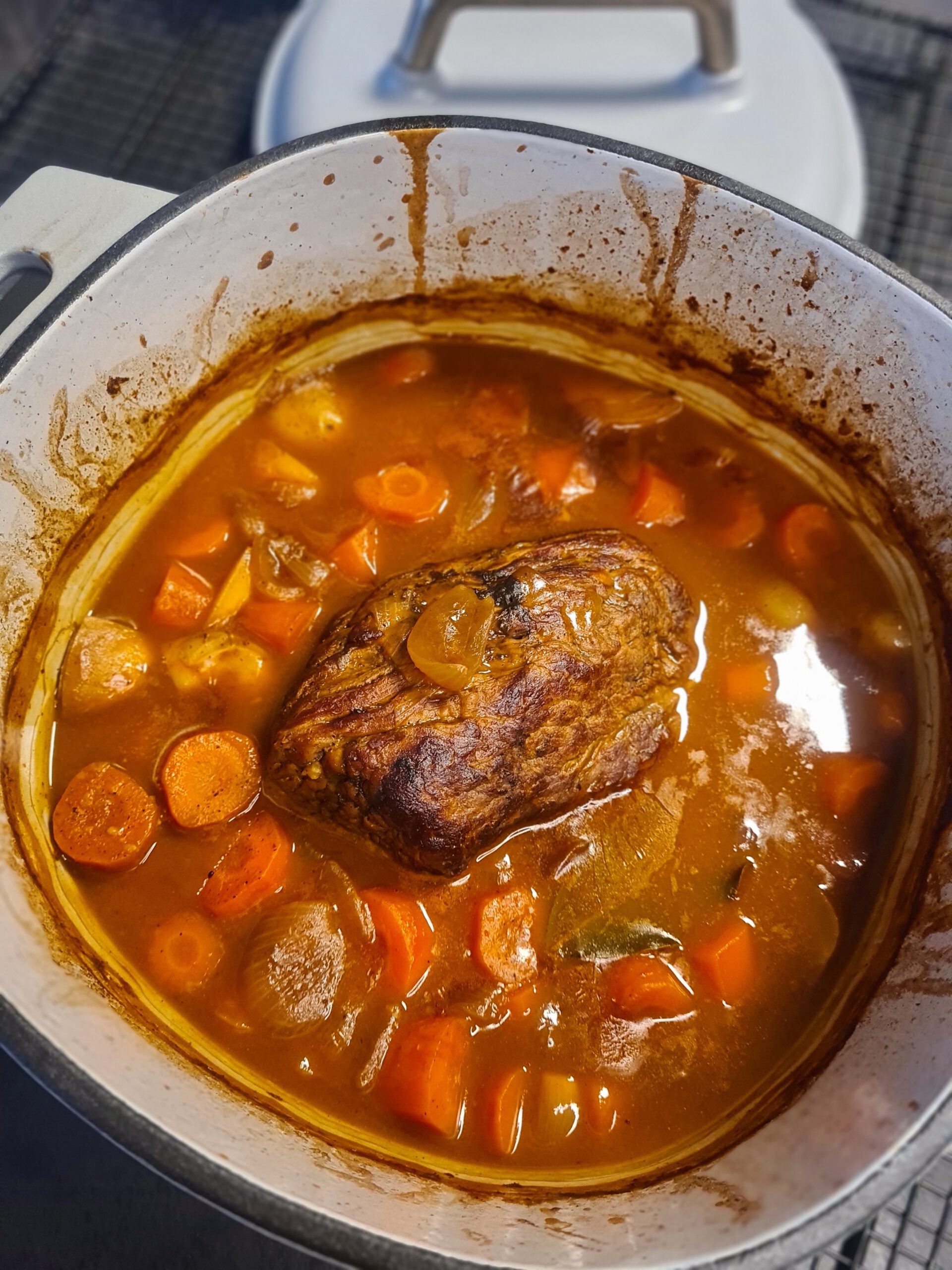 • Die Kartoffeln und Karotten darum verteilen. Lorbeerblatt dazu geben