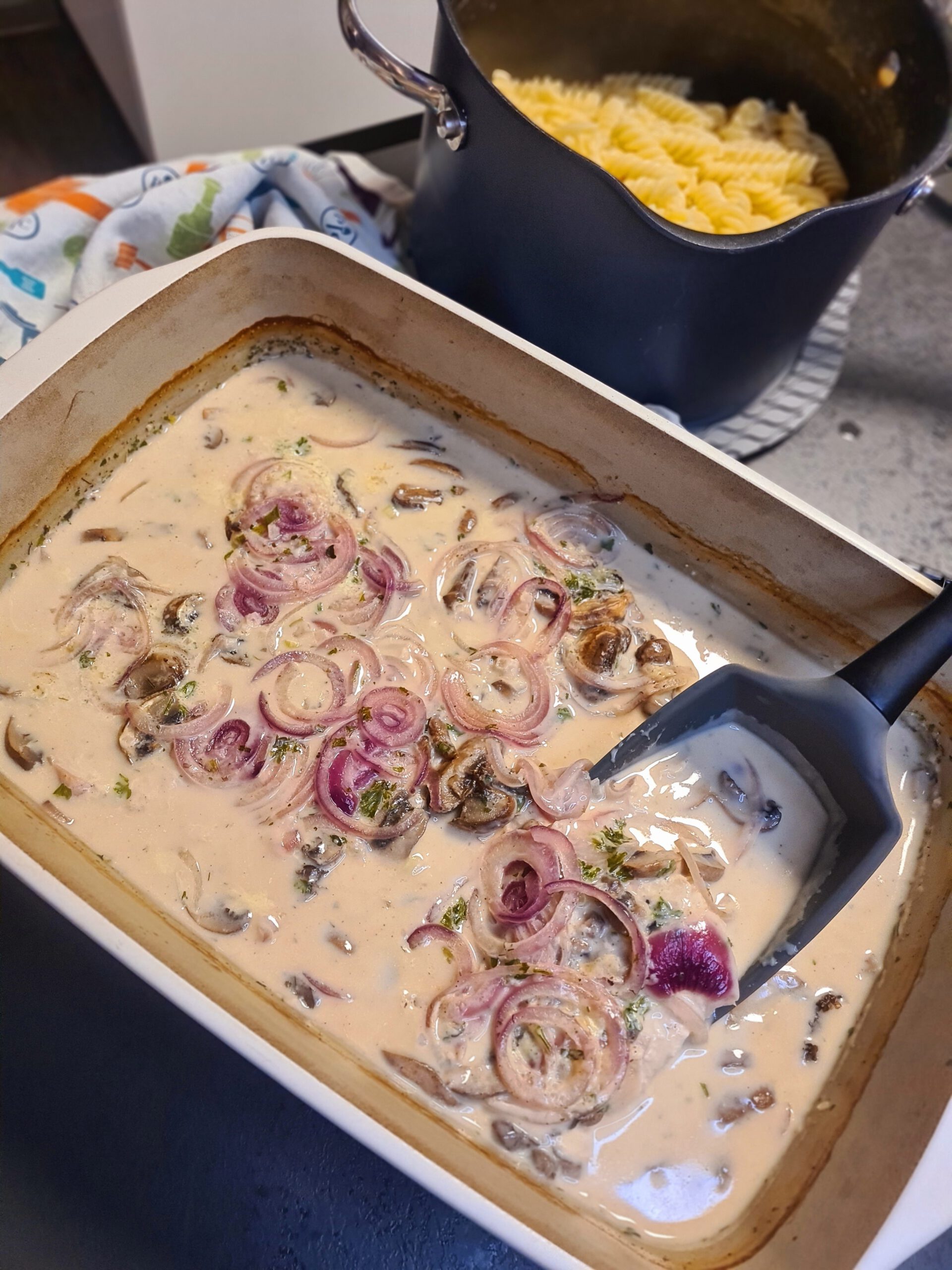- Zum Ende der Backzeit Beilage nach Wunsch zubereiten, z.B. NudelnNudeln als Beilage