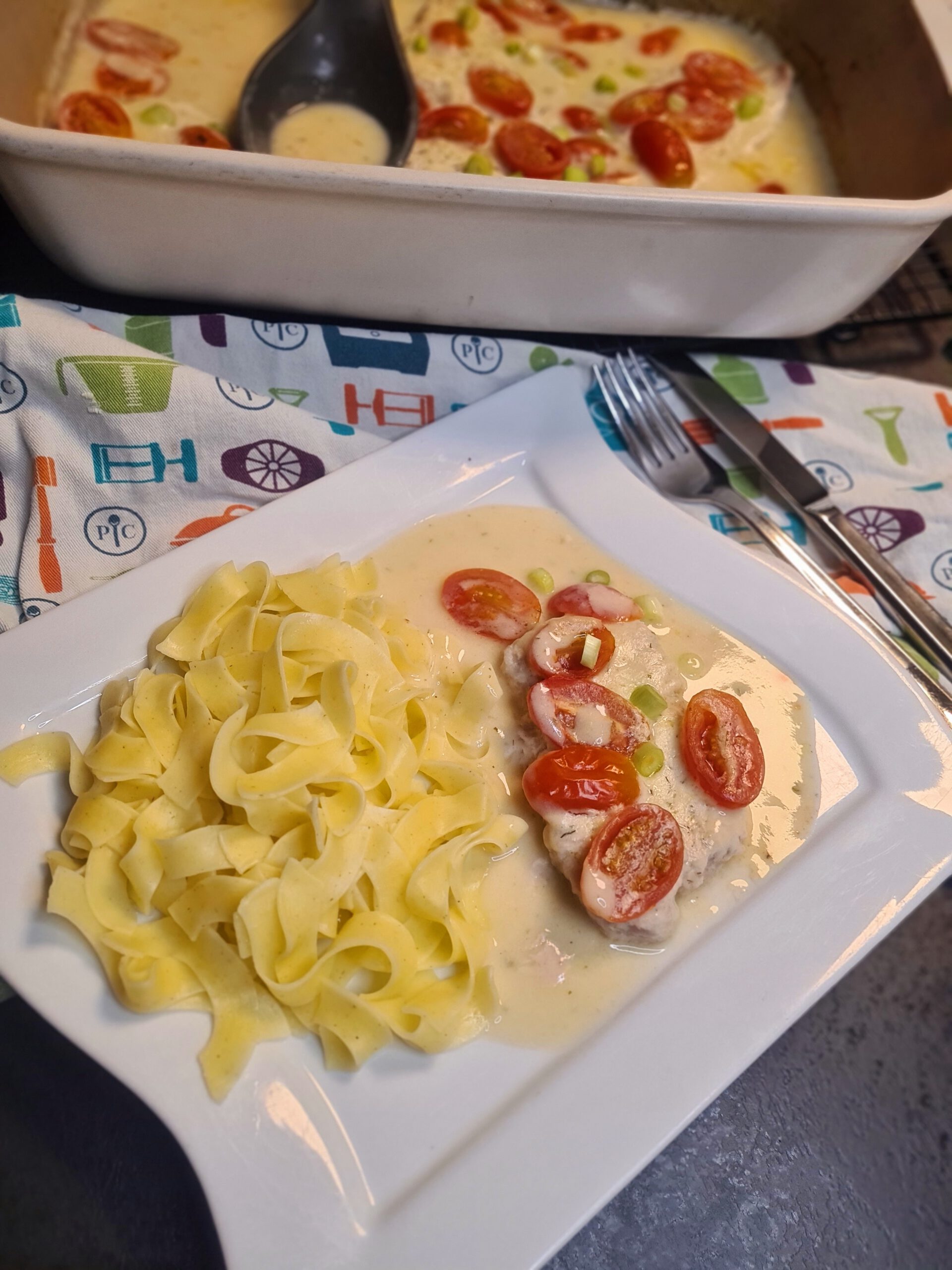 • Für die Soße: Cremefine, Frischkäse, Wasser, Salz, Mehl und Pfeffer gut miteinander verrühren