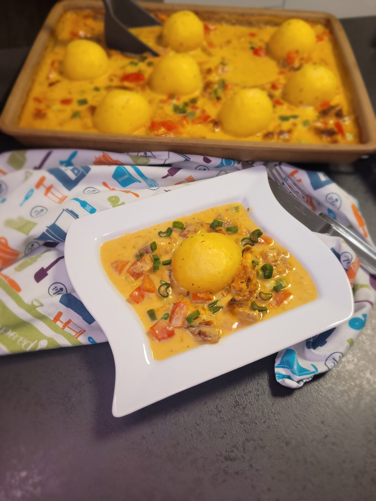 • Soße auf den großen Ofenzauberer geben, auch über die Knödel