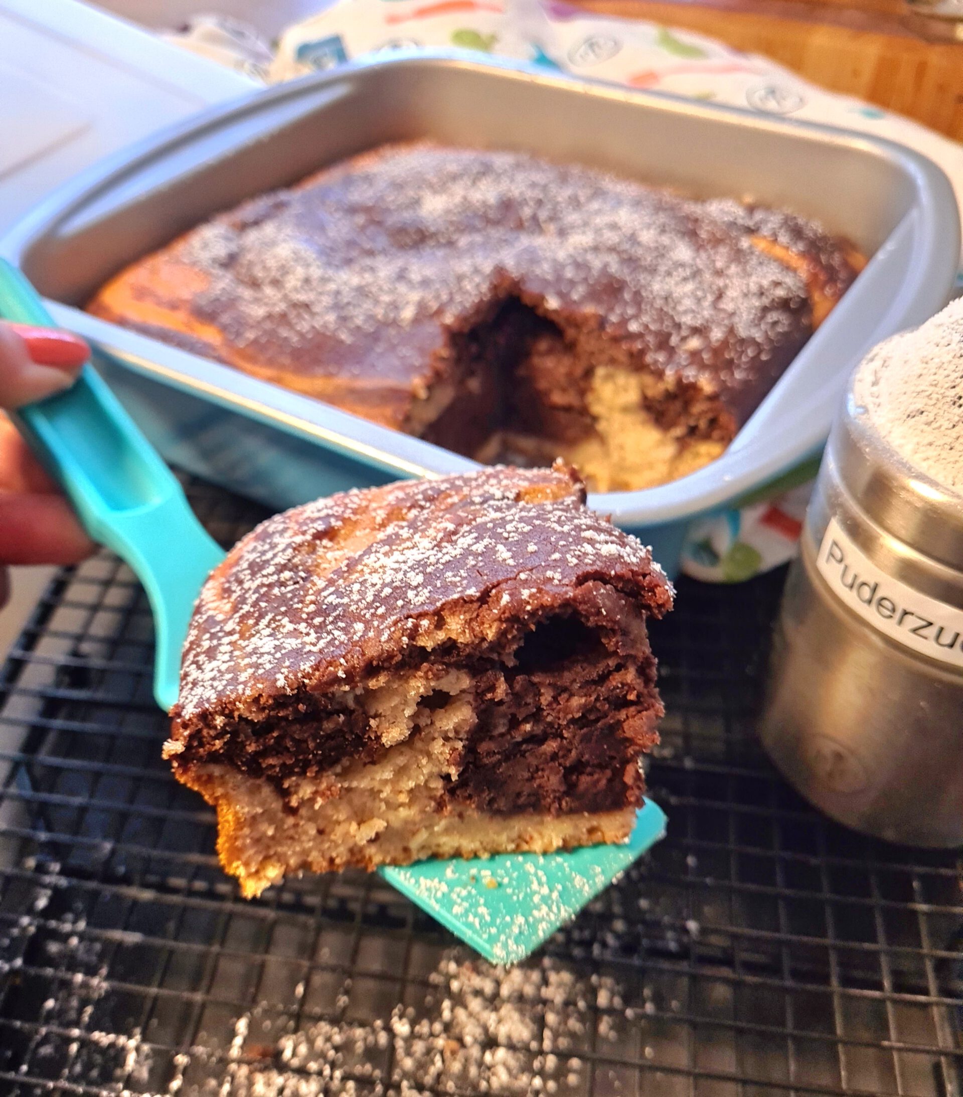 - Den Kakao Teig auf den hellen Teig in die Backform geben und mit dem Kuchenheld die Teige etwas vermengen, wie bei einem Marmorkuchen