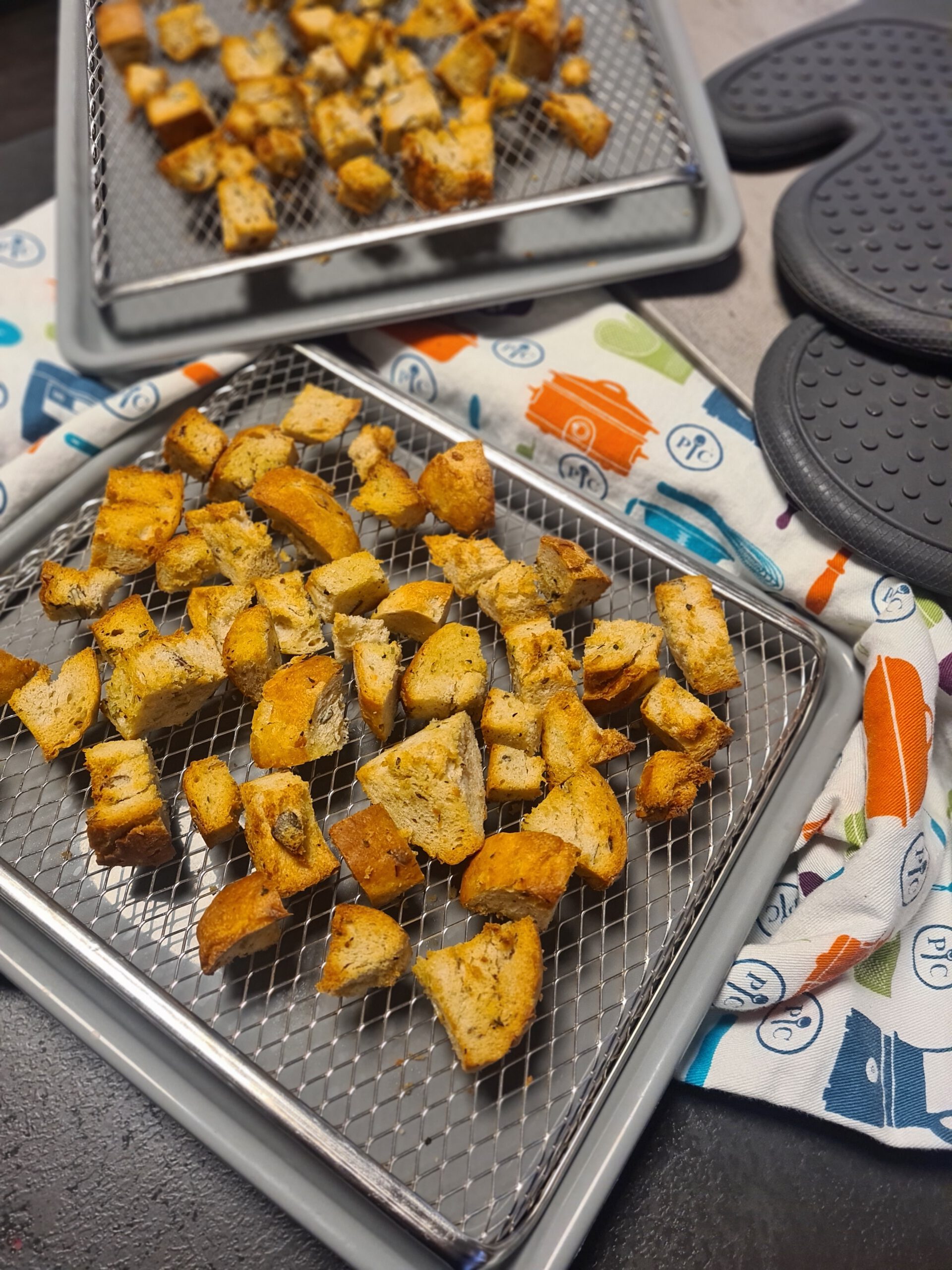 - Olivenöl, Salz und Kräuter vermengen, über die Brötchenwürfel geben und gut vermengenOlivenöl nach Wunsch, etwas Salz, etwas Kräuter de Provence
