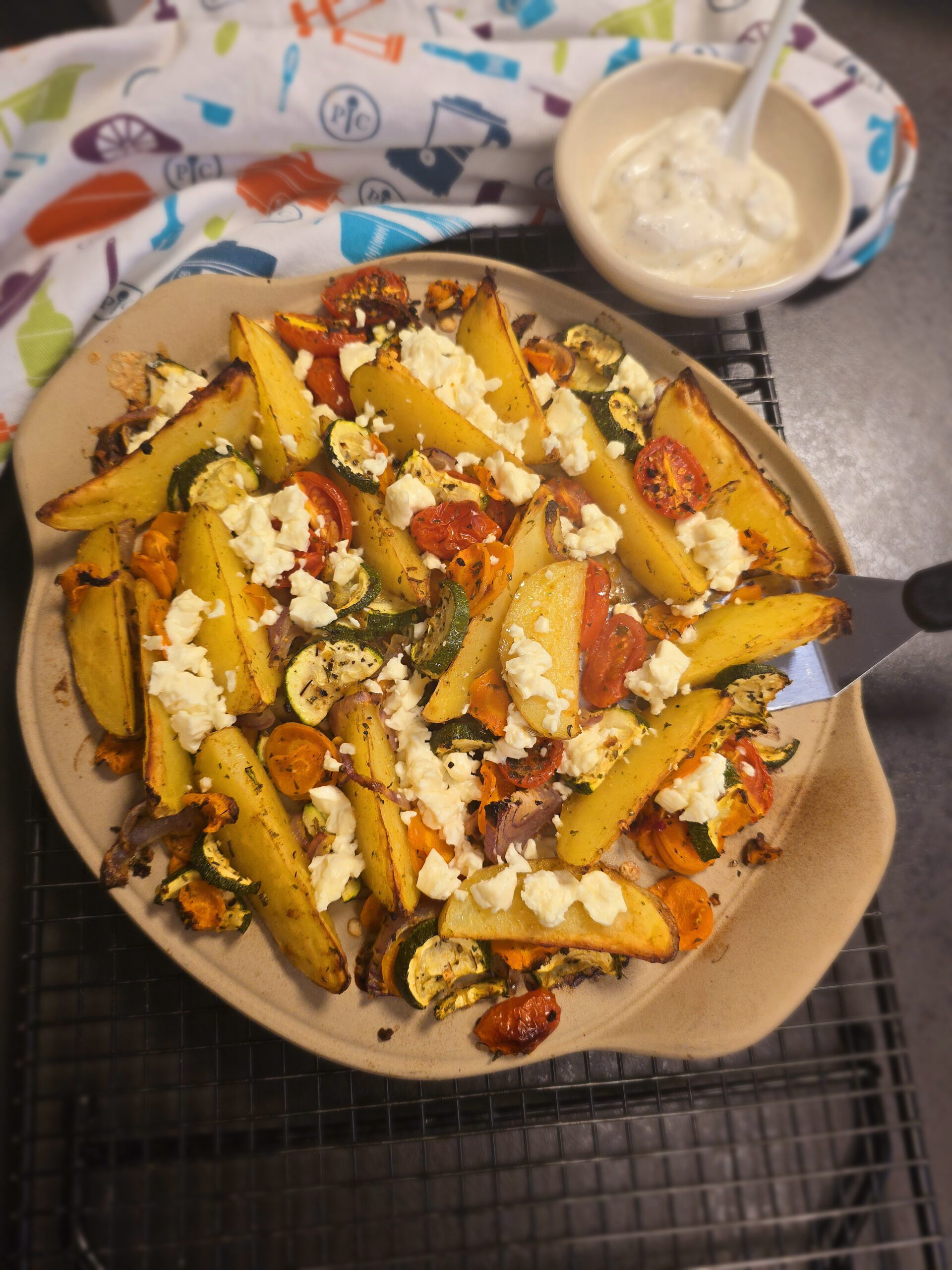 • Nach der Backzeit Feta zerkrümeln und über den Kartoffeln und dem Gemüse verteilen