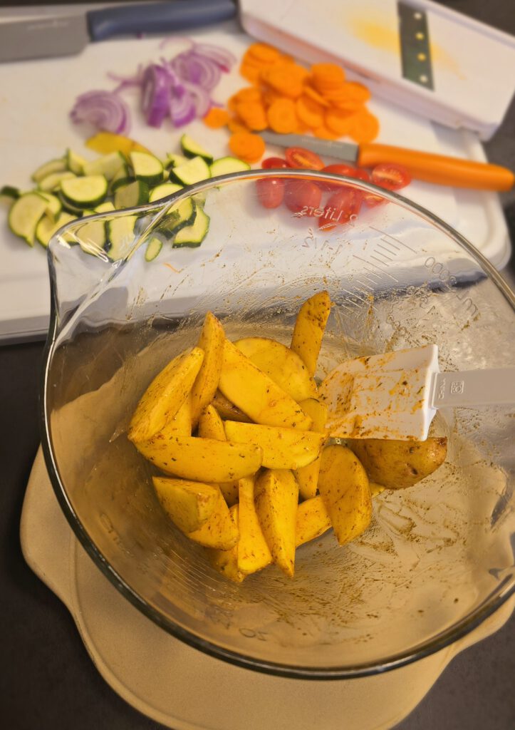 Mit Olivenöl, Kartoffelgewürz und Salz vermengen