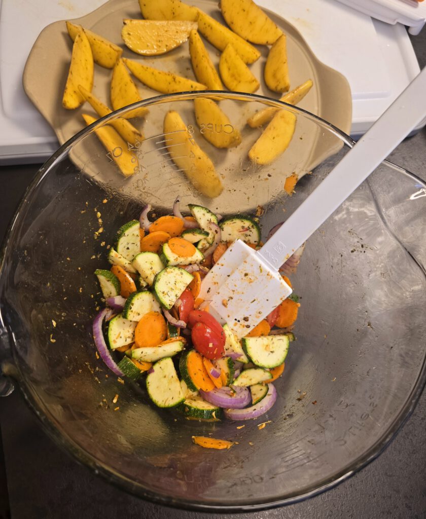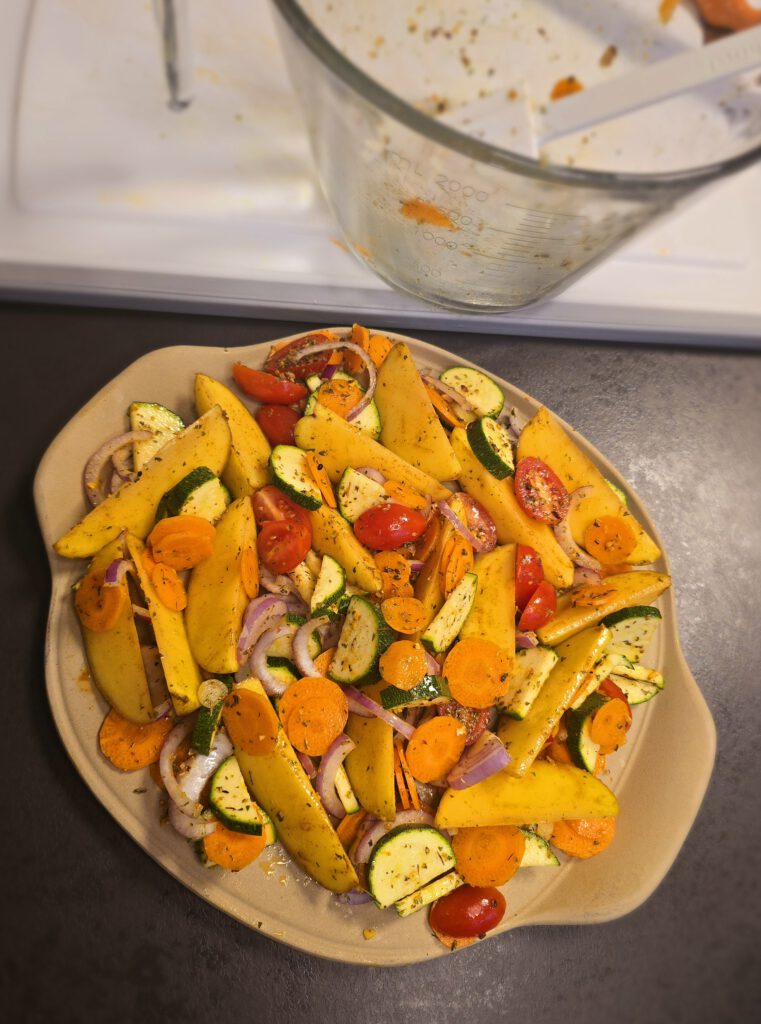 Gemüse in die Nixe geben, etwas Olivenöl, Gemüsegewürz und Salz dazu geben. Alles gut vermengen
