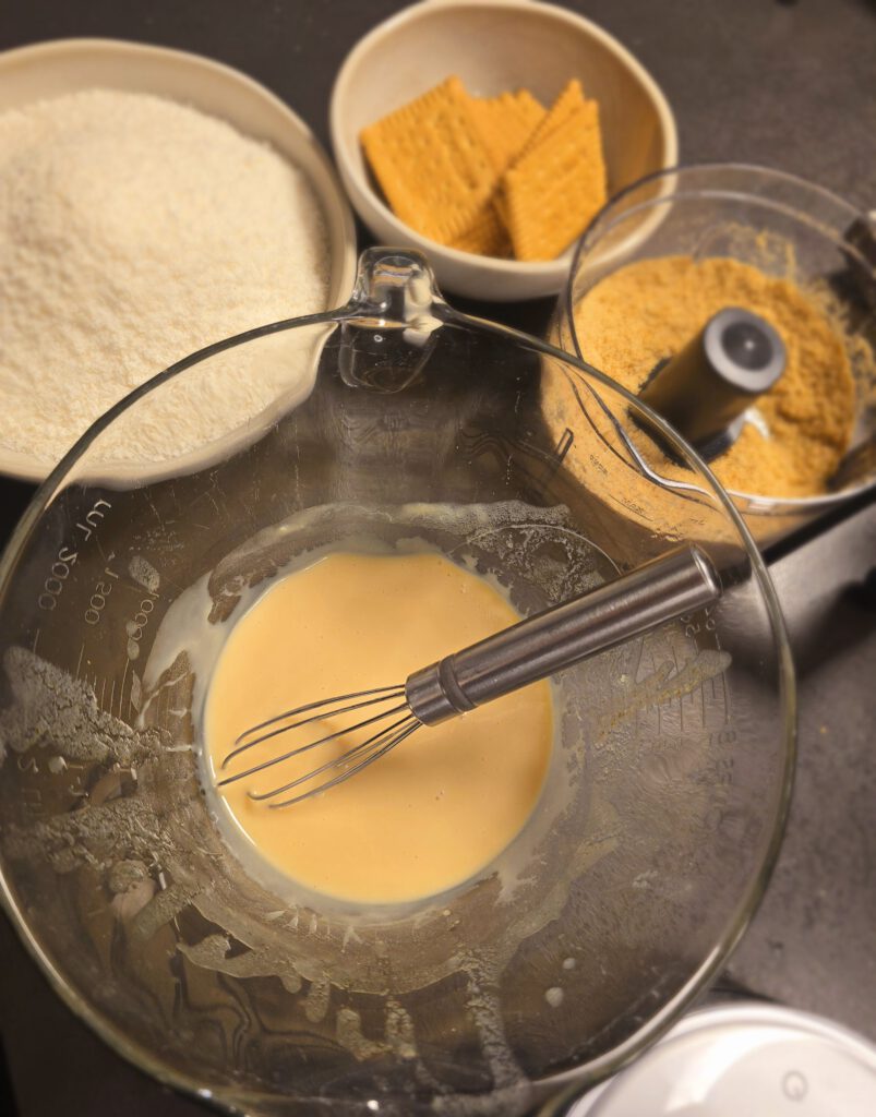 - Geschmolzene Butter, Kondensmilch und Vanillextrakt in die große Nixe geben und mit einem Schneebesen verrühren40 gr. geschmolzene Butter, 230 gr. gezuckerte Kondensmilch, 1 TL Vanilleextrakt