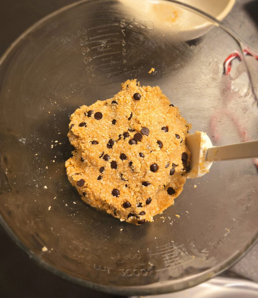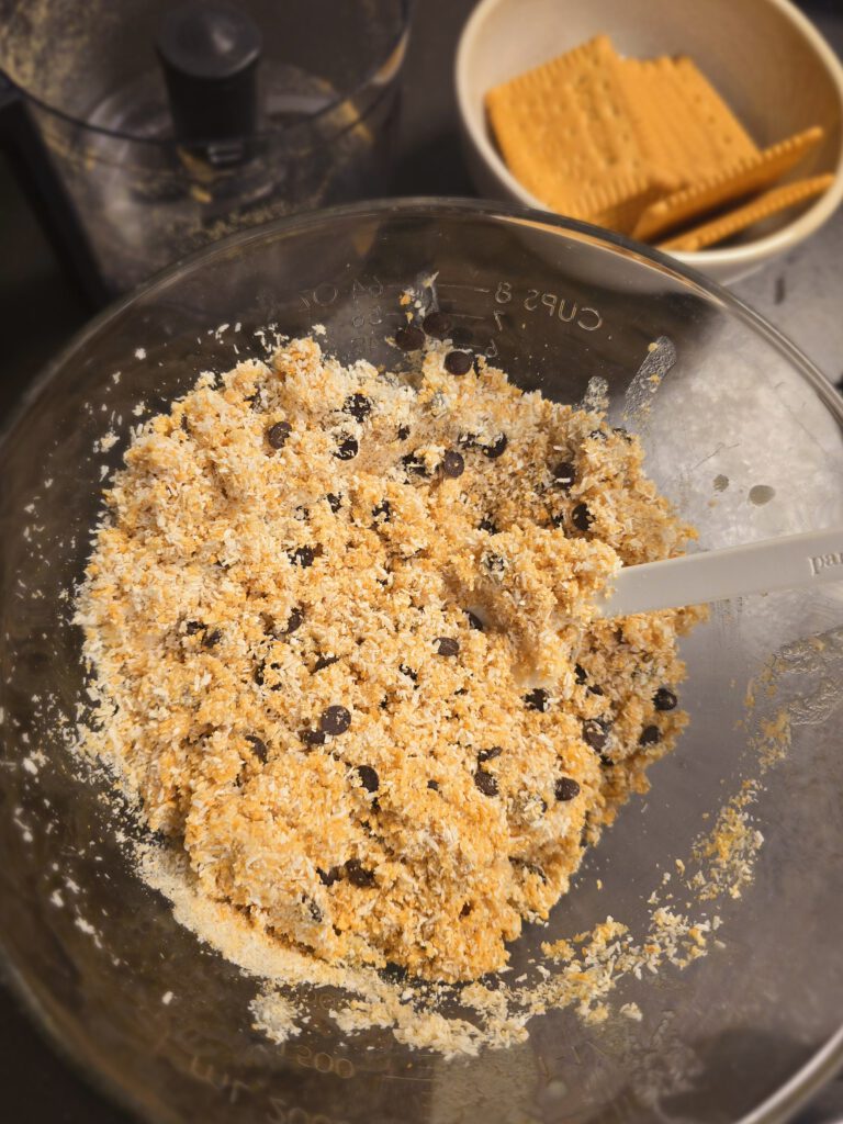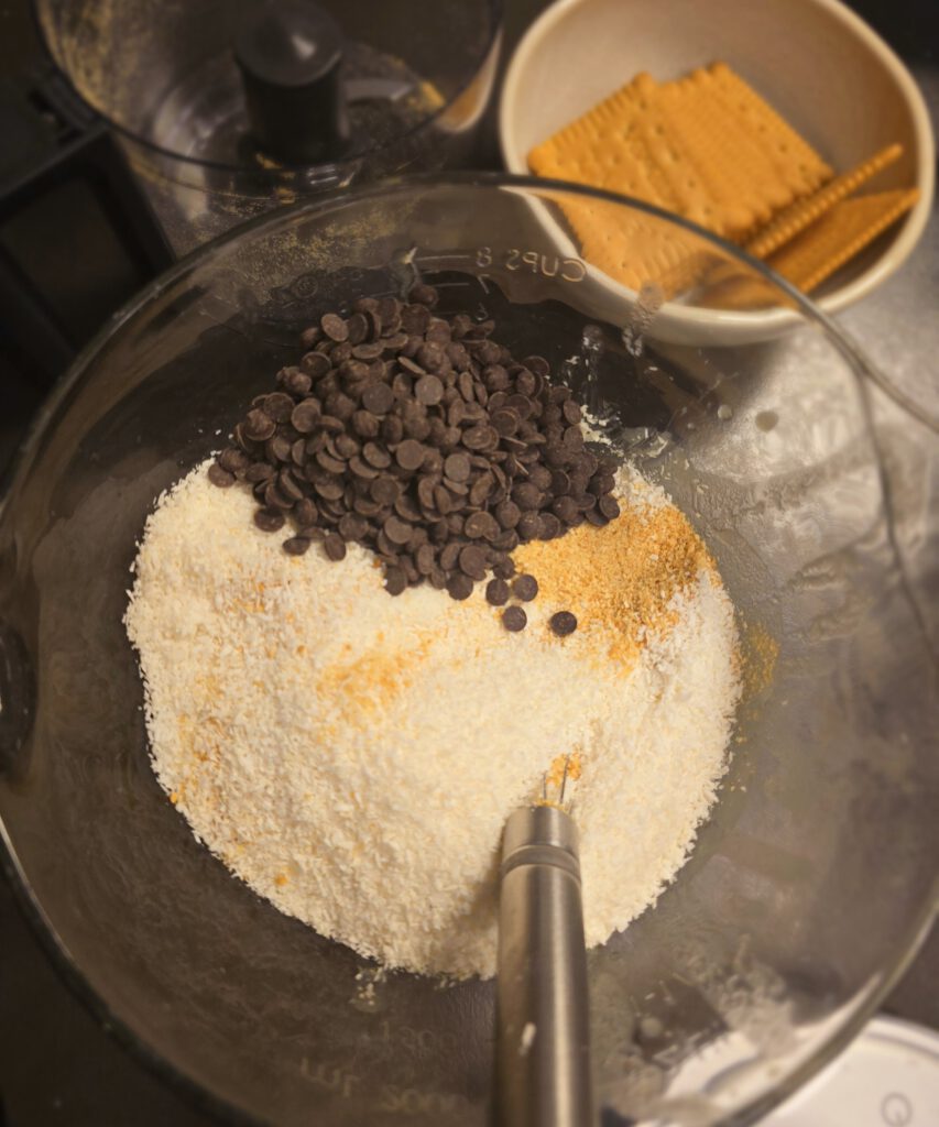 - Butterkekse, Schokotröpfchen und Kokosraspeln dazu geben100 gr. Schokotröpfchen Zartbitter, 150 gr. Kokosraspeln