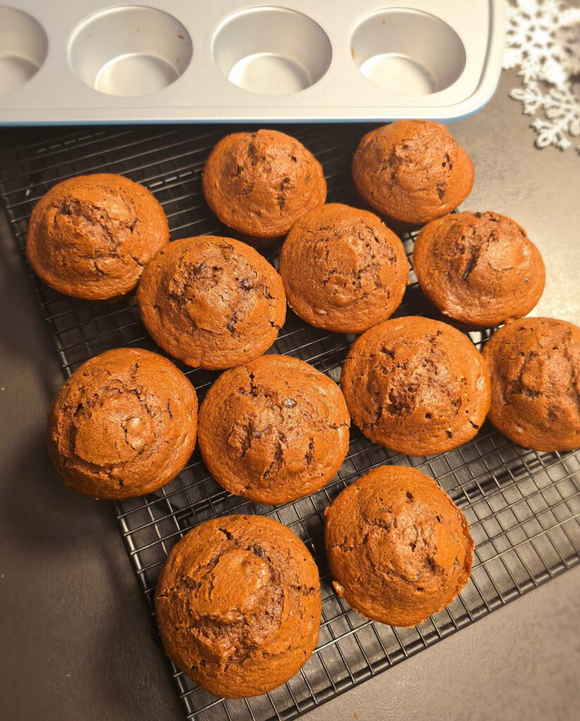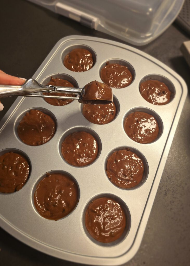 - Teig mit dem Edelstahlportionierer auf die Mulden der Muffinform aufteilen