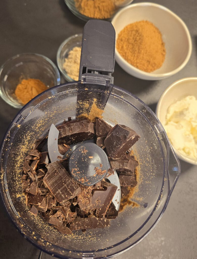 - Schokolade in grobe Stücke schneiden und ebenfalls in den Elektrischen Multi-Zerkleinerer "Up & Down" geben150 gr. Blockschokolade Zartbitter