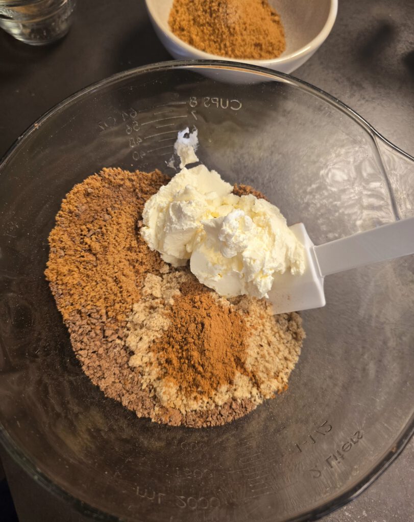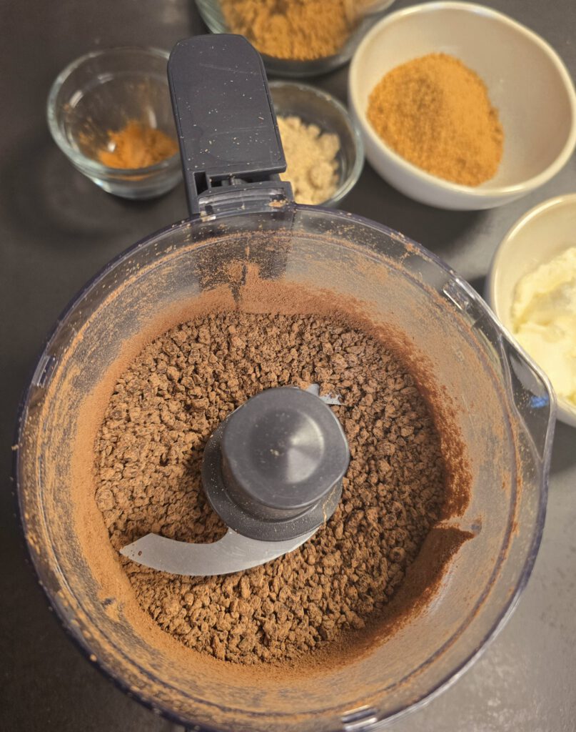 - Zu den Spekulatius in der großen Nixe Spekulatiusgewürz, Zimt, Nüsse, Schokolade und Frischkäse geben50 gr. gemahlene Haselnusskerne, 1 gestrichener TL Zimt, 1 gestrichener TL Spekulatiusgewürz, 120 gr. Frischkäse natur