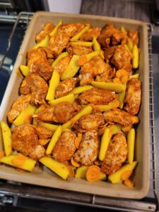 Olivenöl mit Gewürze vermengen, zu den Karotten und Kartoffeln geben und gut durch rühren