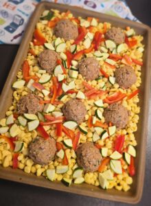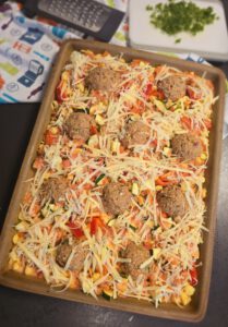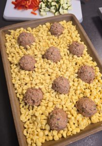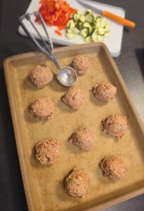 Aus dem Hackfleisch mit Hilfe des kleinen Edelstahlportionierers 10 Hackbällchen formen und auf den großen Ofenzauberer legen