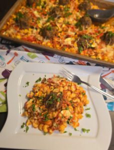 Soße über die Knöpfli und das Gemüse gießen und verteilen