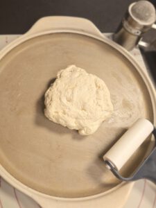 Backofen auf 230 Grad Ober- und Unterhitze vorheizen,Stein dünn einfetten Magerquark, Mehl, Salz und Backpulver zu einem Teig verkneten.Thermomix: 2 Min. / Knetstufe 300 gr. Magerquark, 230 gr. Dinkelmehl, 2 gestrichene TL Backpulver, 1/2 TL Salz