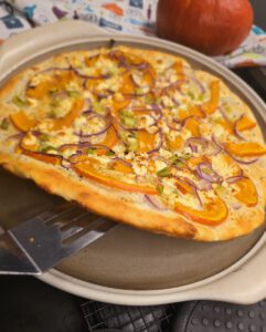 Kürbis in dünne Scheiben schneiden, darauf verteilen und mit Kürbisgewürz oder Salz & Pfeffer würzen